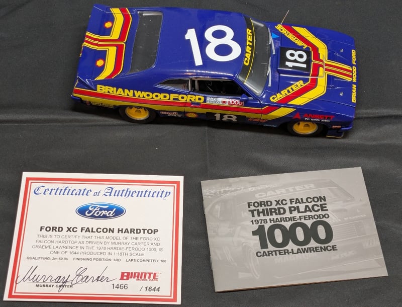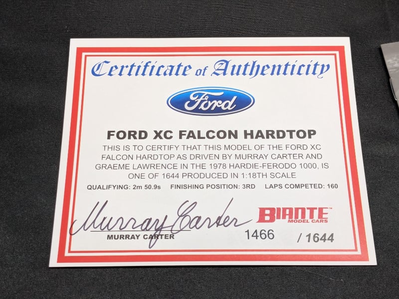 LIMITED EDITION AUTOART 1:18 FORD FALCON XC HARDTOPItem Size: Height: 36cm, Width: 10cm, Depth: 17cmThird Place, 1978 Hardie-Ferodo 1000Edition: 1466/1644Includes Certificate Of AuthenticityCondition: Good - Refer To Images585066+14