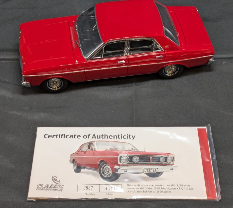 LIMITED EDITION CLASSIC CARLECTABLES 1968 FORD FALCON XT GTItem Size: Height: 25cm, Width: 10cm, Depth: 8cmScale: 1:18Colour: Candy Apple RedEdition: 887/3500Note: Minor Detached Parts, Refer To PhotosCondition: Good - Refer To Images585066+19