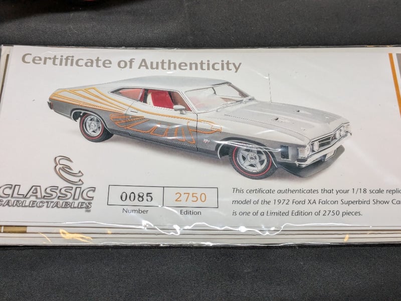 LIMITED EDITION CLASSIC CARLECTABLES 1972 FALCON XA FALCON, SUPERBIRD SHOW CARItem Size: Height: 35cm, Width: 17cm, Depth: 16cmScale: 1:18Edition: 85/ 2750Includes Certificate Of AuthenticityCondition: Good - Refer To Images585066+33