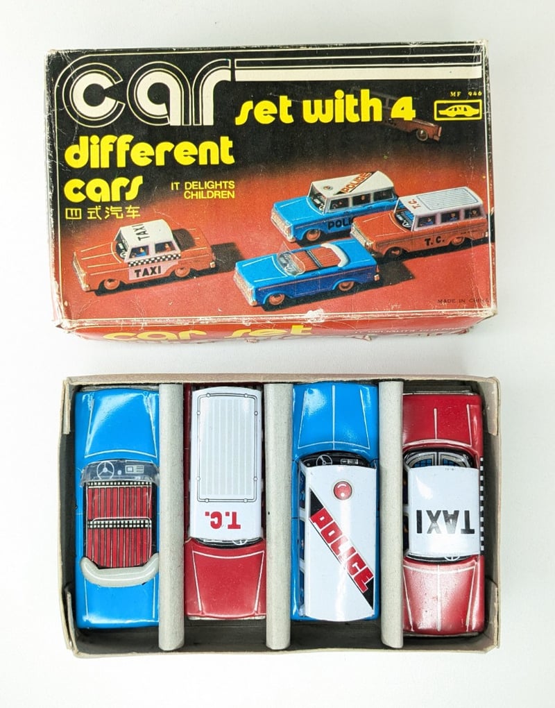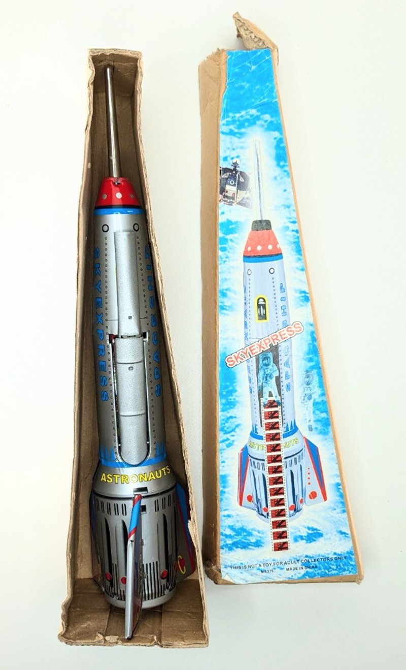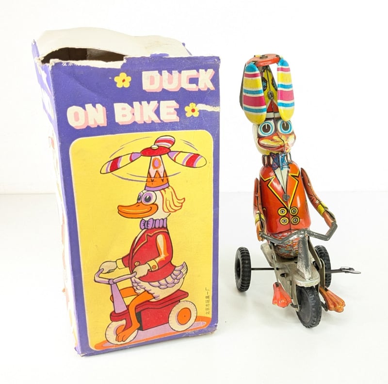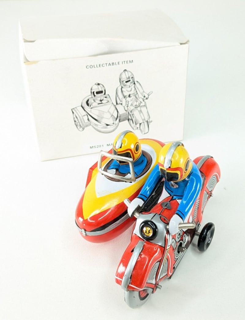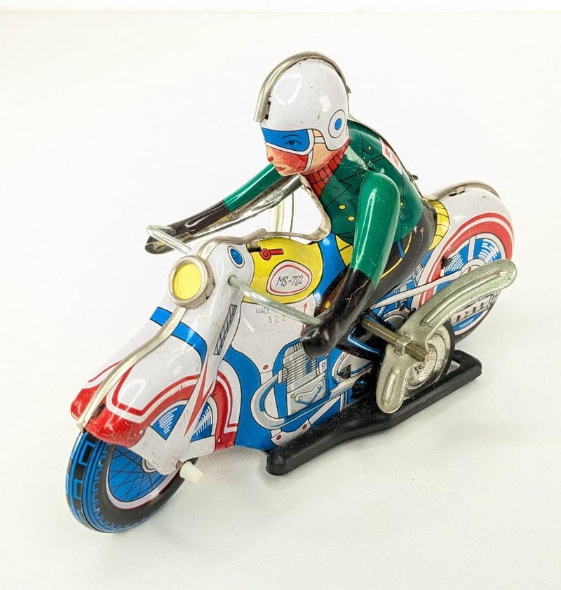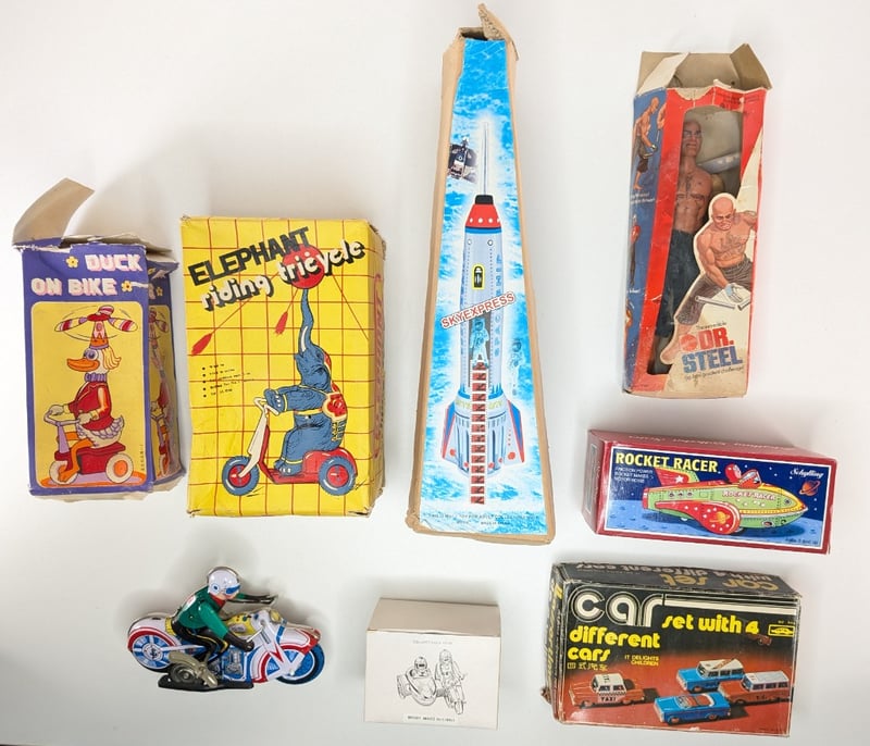 Collection Includes, "Duck On Bike" Tin Litho Wind-Up Toy, Wind-Up Motorcycle Toy, Model Ms-702, China Mf-946 Emergency & Taxi Car Tin Friction Toy Set, Ms281 Vintage Motorcycle With Sidecar Clockwork Tin Toy Collectible, Schylling Elephant On Bike Tin Wind-Up Toy, Schylling Rocket Racer Tin Friction Toy, Sky Express Tin Toy Rocket (Model Ms378) And, Mattel Big Jim Dr. Steel Action Figure, Reference Number 7367.