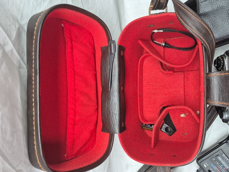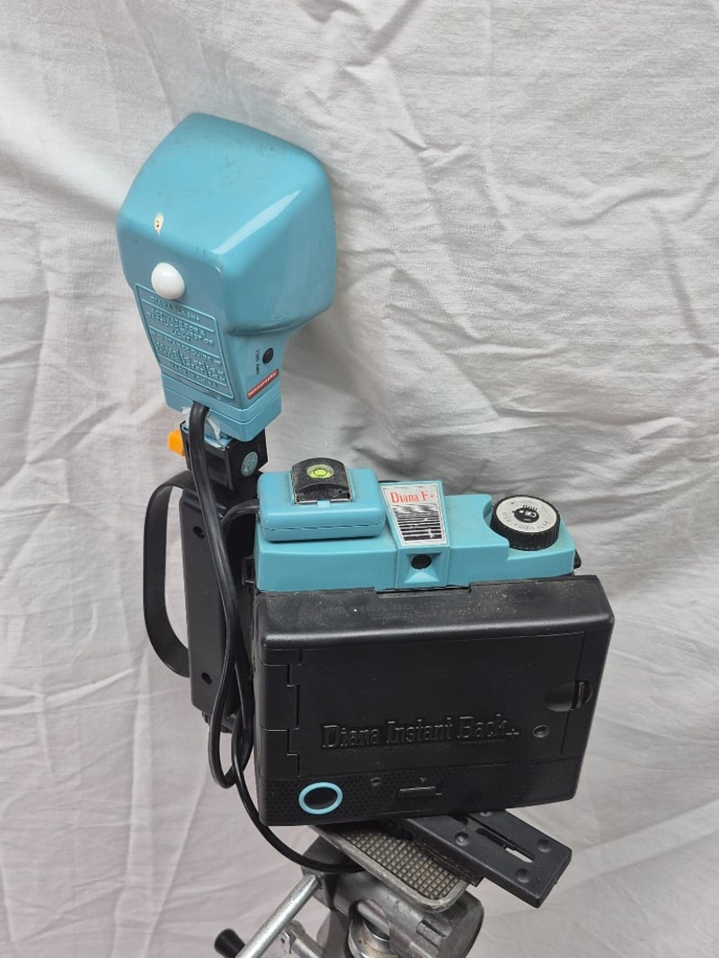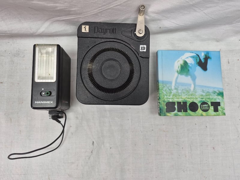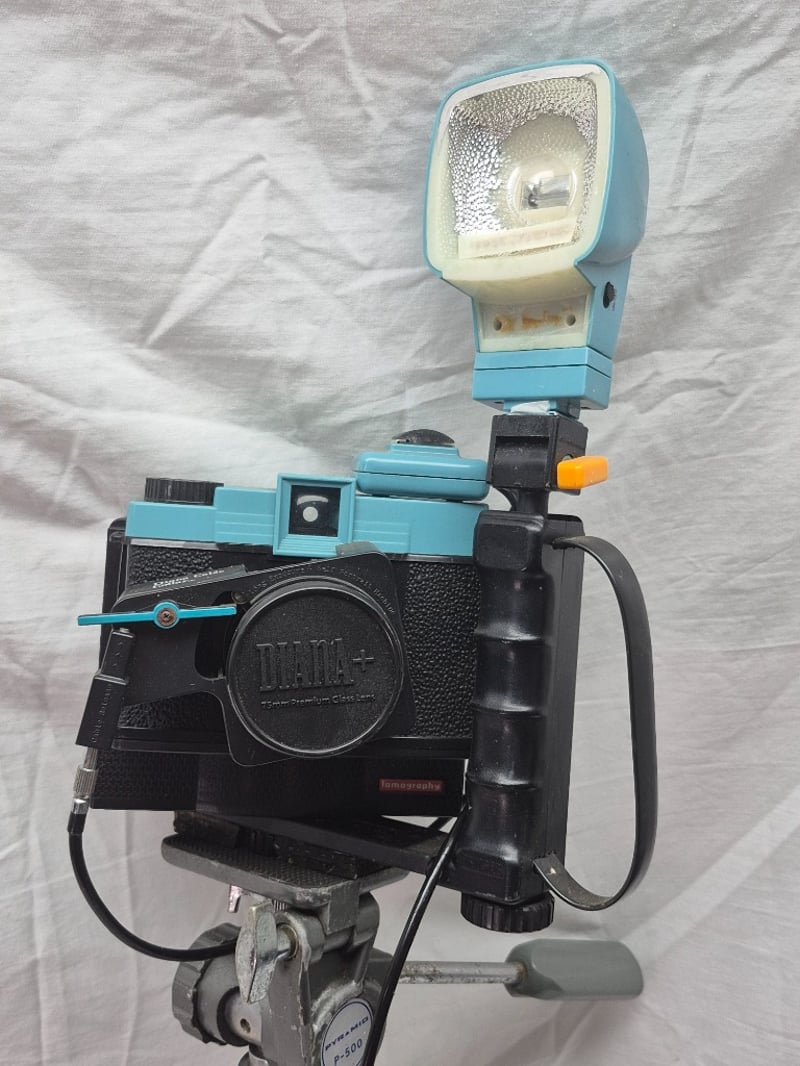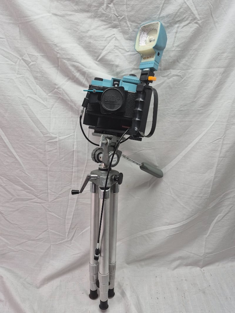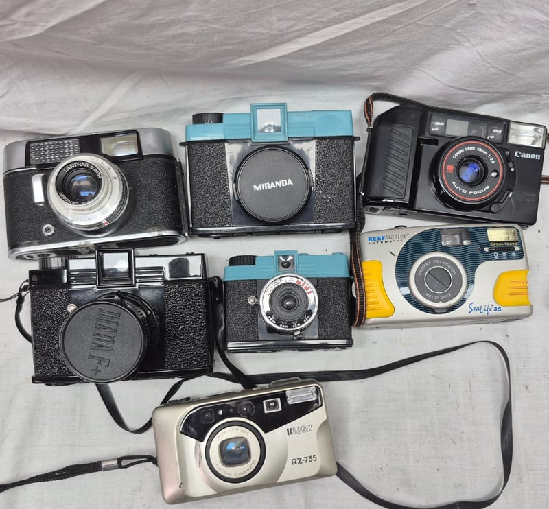 Camera Collection Comprising Multiple Film Cameras Including Miranda, Canon, Fujica, And Nikon Models; Pentax 35Mm Slr; Hanimex Flash Unit; Darroll Film Rewind Mechanism With Red Components; Diana Instant Camera; Tripod With Pan-Tilt Head And Blue Flash Attachment.
