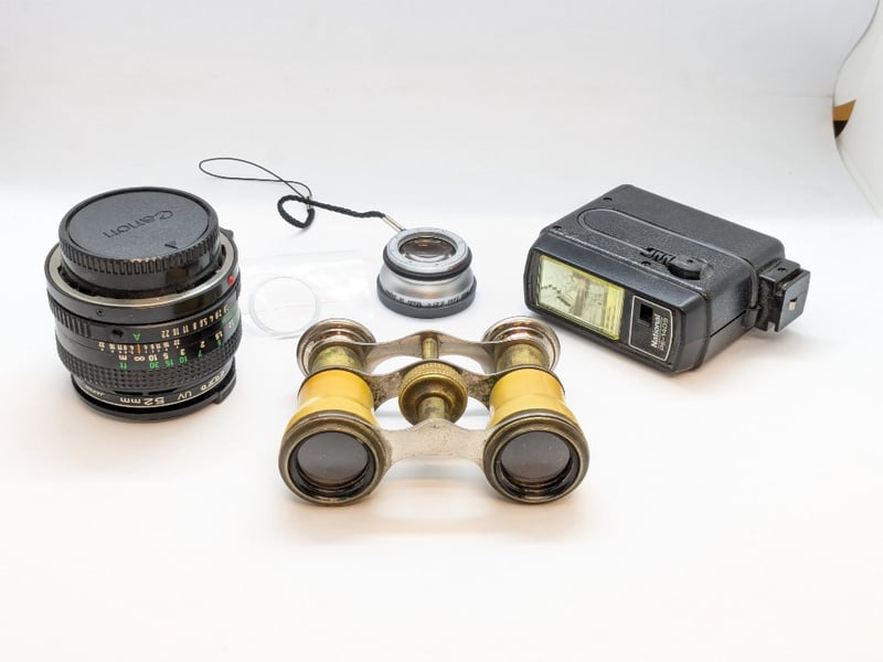 Includes Opera Theatre Binoculars, Canon Fd 50Mm Lens, Crystal Vision Digital M-Power Wide Lens 0.45, National Pe-1405 Flash