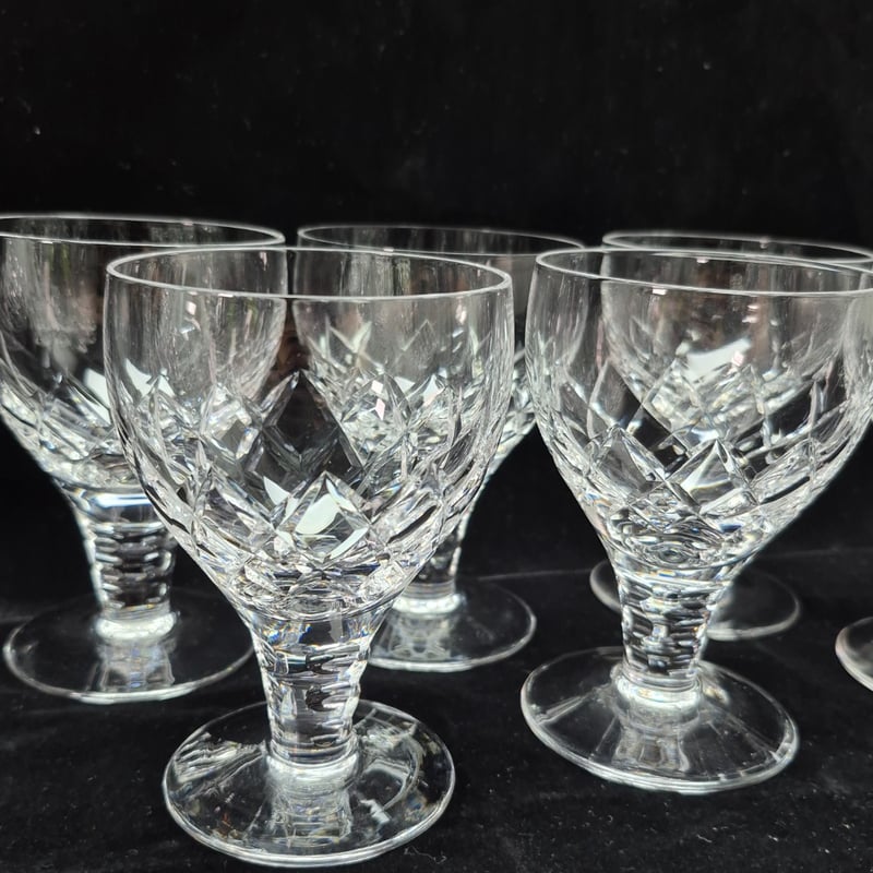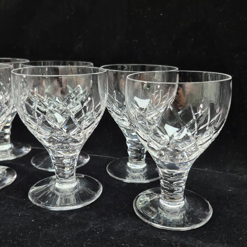 The Collection Includes Multiple Drinking Glasses In Varying Sizes (Tumbler And Stemmed Goblet Styles) And Two Decorative Decanters With Stoppers.