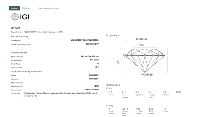 Please note that while all lab grown diamonds listed include certification, the report number or identification may vary upon arrival. This is due to standard manufacturing and batching processes. However, the diamond’s specifications — including carat, color, cut, and clarity — will match or may even exceed those advertised.