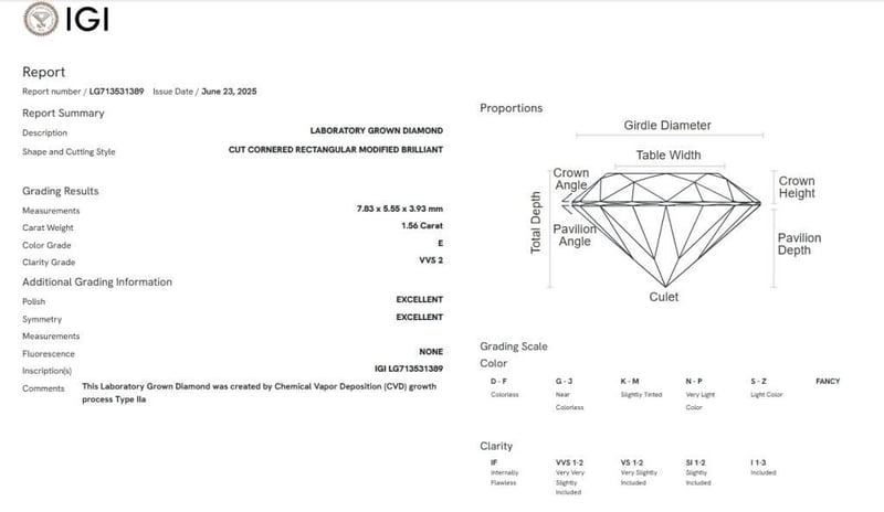 Please note that while all lab grown diamonds listed include certification, the report number or identification may vary upon arrival. This is due to standard manufacturing and batching processes. However, the diamond’s specifications — including carat, color, cut, and clarity — will match or may even exceed those advertised.