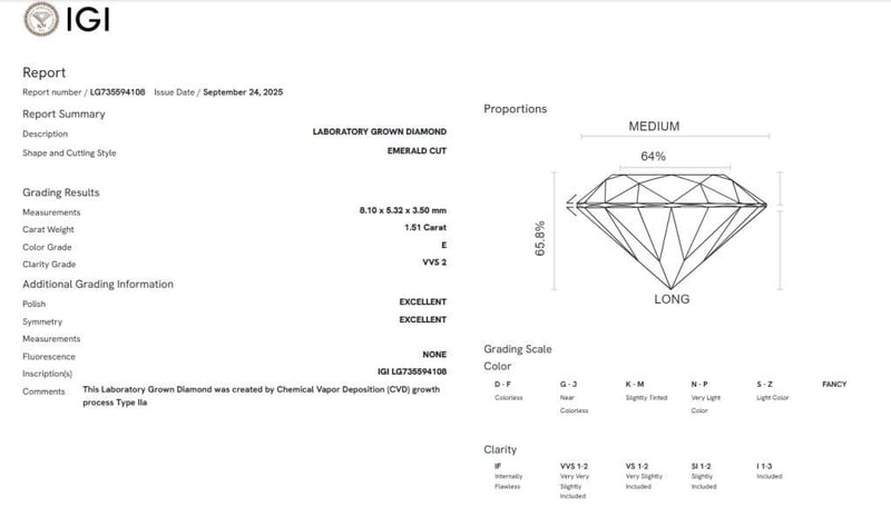 Please note that while all lab grown diamonds listed include certification, the report number or identification may vary upon arrival. This is due to standard manufacturing and batching processes. However, the diamond’s specifications — including carat, color, cut, and clarity — will match or may even exceed those advertised.