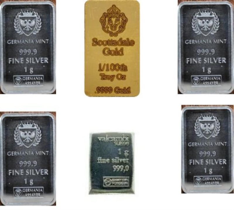 1/100 SCOTTDALE GOLD BAR X 2, 1 GRAM VALCUMBI SILVER BAR X 1 & 1 GRAM GERMANIA MINT SILVER BAR X 4