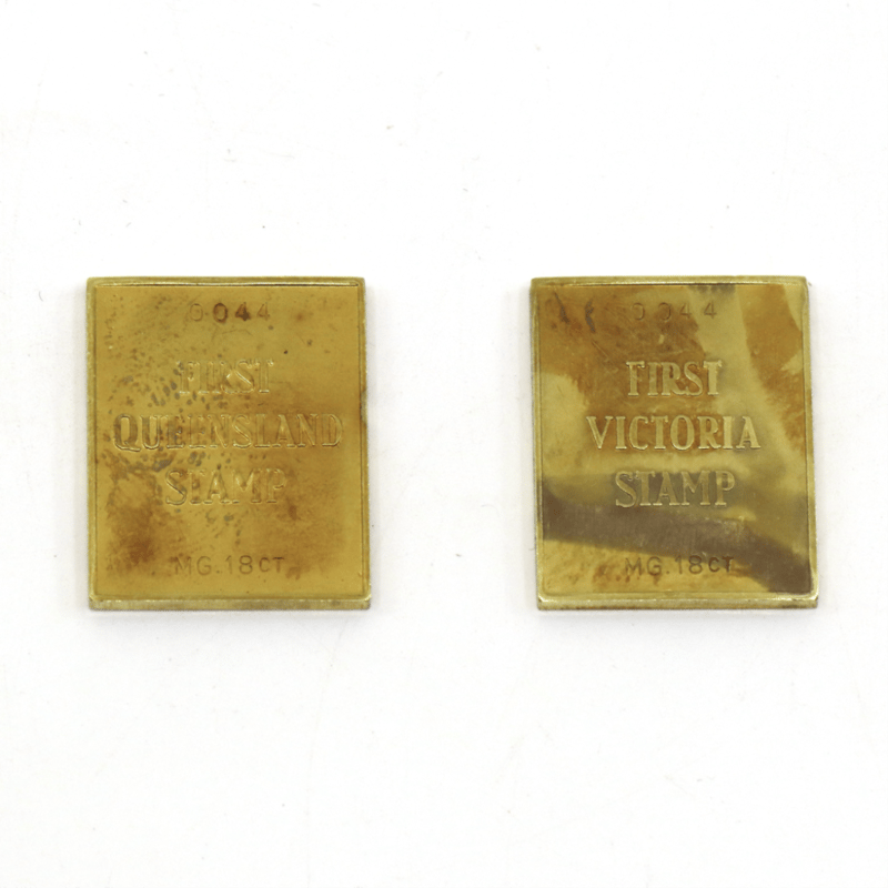2 X 18K GOLD, 1850-1860 REPLICAS OF THE FIRST VICTORIA AND QUEENSLAND POSTAGE STAMPS. In Case Of Issue With Matthey Garrett Certificate Numbered '0044' And Certificate Of Authenticity By The Philatelic Association Of New South Wales Numbered '0044', Some Toning. Queensland Stamp Weighs 10.262Grams. Victoria Stamp Weighs 10.124Grams.Both Stamps Measure 2.3 Cm X 1.8Cm. 645977+9406