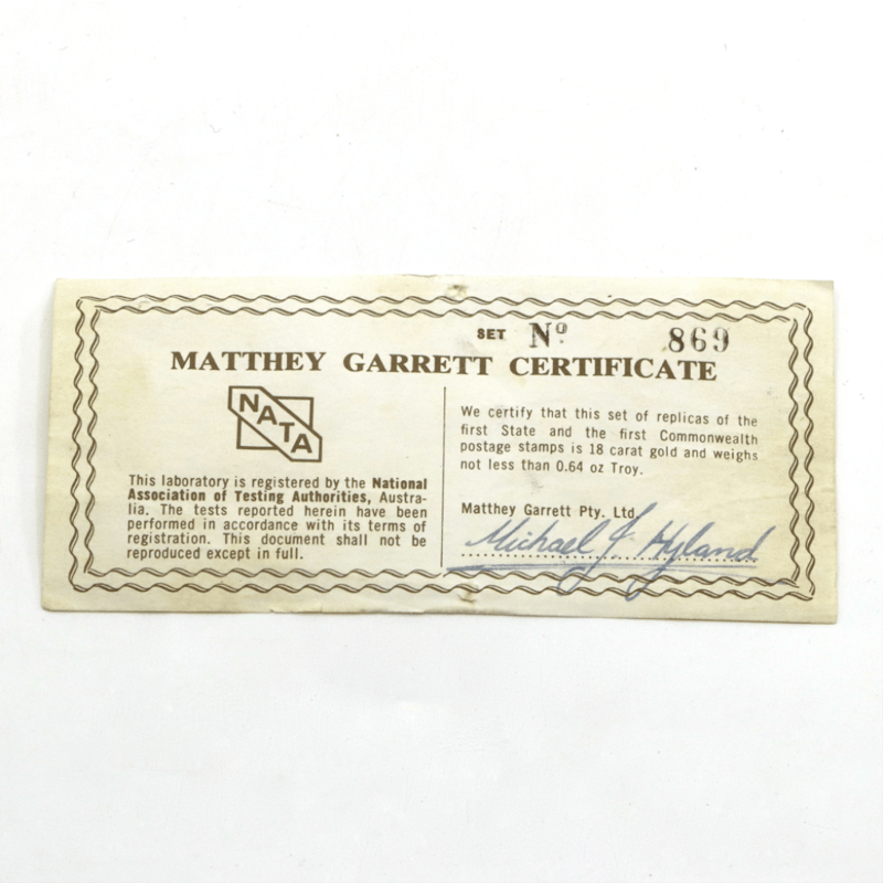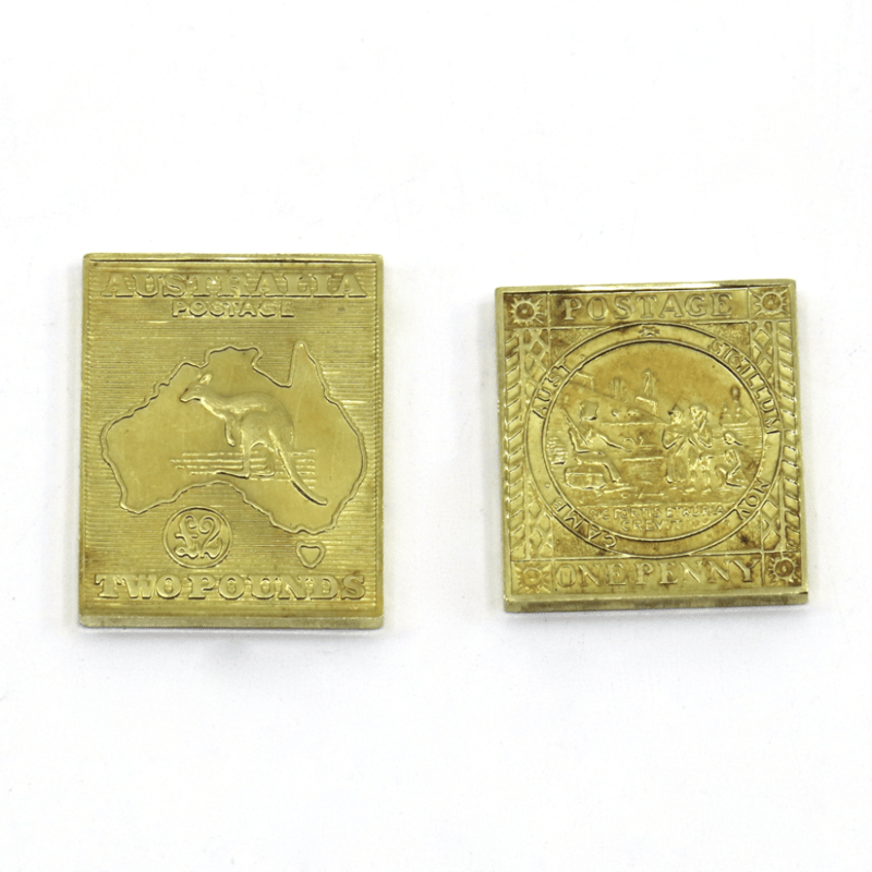 2 X 18K GOLD, 1850 NSW SYDNEY ONE PENNY 'VIEW' REPLICA AND 1913 AUSTRALIA £2 'KANGAROO' REPLICA POSTAGE STAMPS. Limited Edition Replicas, Each With Anpex 1970 And Numbered 869 On Reverse, In A Special Case With Matthew Garrett Certificate Number 869.One Penny Postage Stamp Weighs 10.43Grams.£2 (Pounds) Postage Stamp Weighs 10.49Grams. 645977+9407
