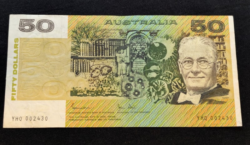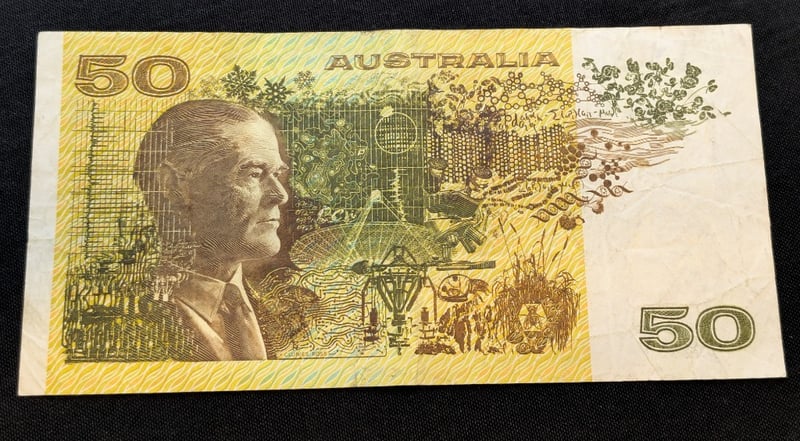 AUSTRALIAN FIFTY DOLLAR BANK NOTE WITH ERROR, FINE 1983 JOHNSTON/STONE SIGNEDError Includes Misaligned Serial Numbers, A Piece Of Numismatic History584436+10