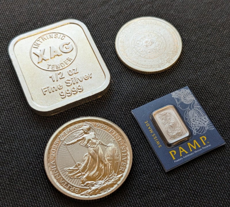 COLLECTION OF SILVER BARS AND COINSIncludes 1 Gram 999.5% Platinum Pamp In Assay Card,1/2 Oz Silver Xag Minted Bar, 2025 Uk Britannia 1/4 Oz 999 Silver, Aztec Sunshield 1/10 Oz 999 Silver584436+1