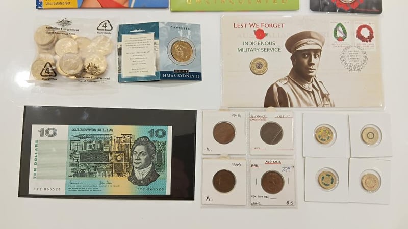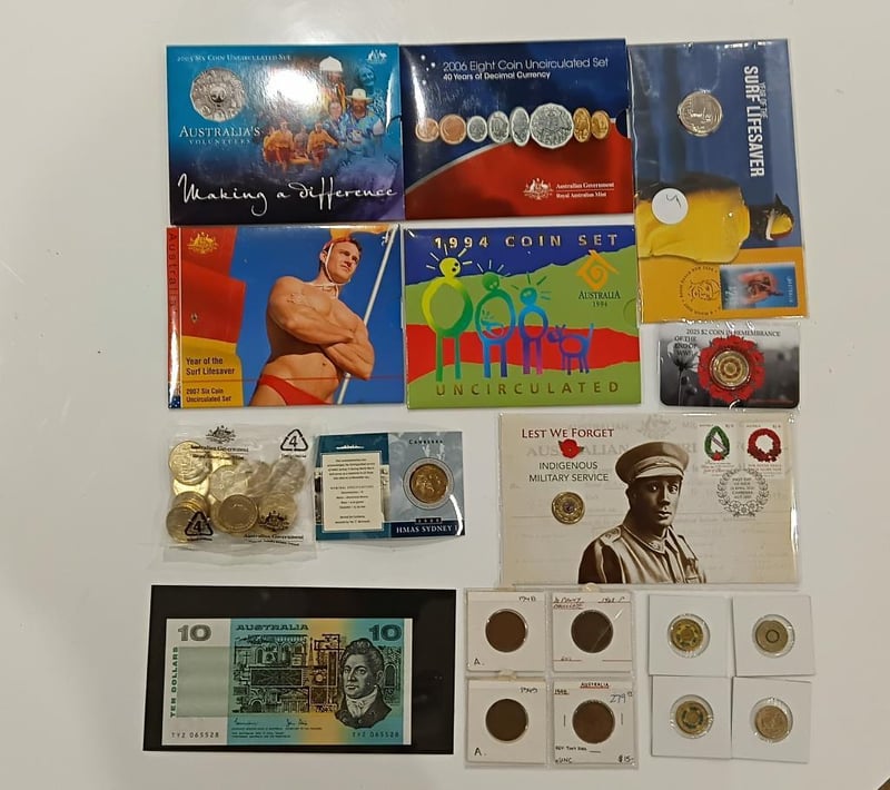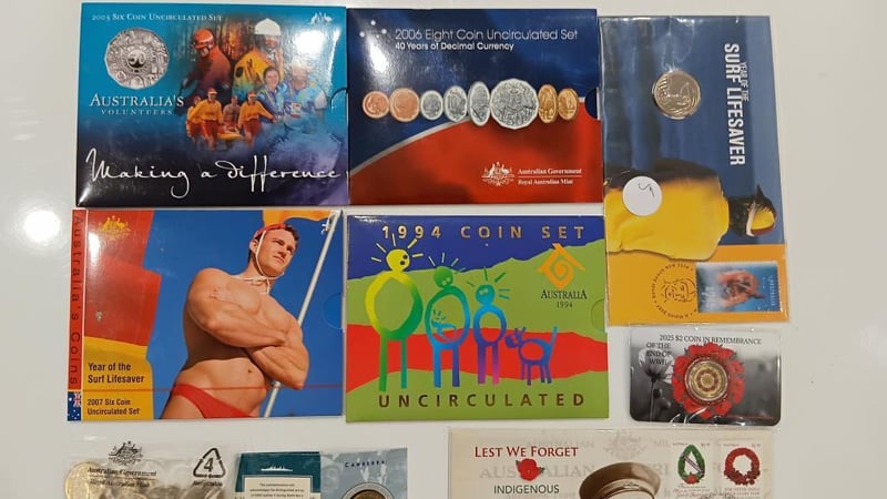 COLLECTION UNC SETS COMMEMORATIVE SET, 2025 RED POPPY PLUS VARIOUS ITEMS, COLOURED $2 DOLLARS UNC SETS 1990 10 DOLLAR UNC, ETC