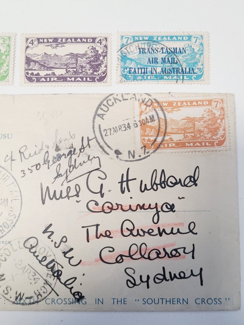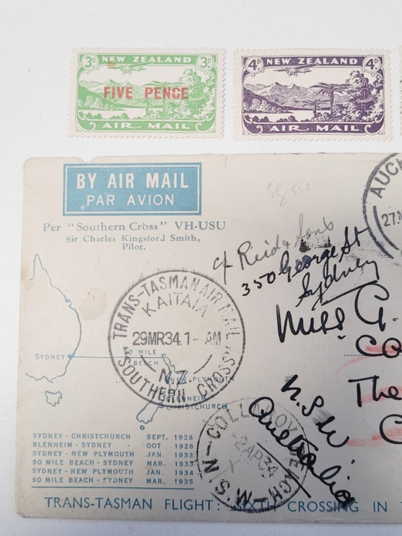 1934 SIR CHARLES KINGSFORD SMITH PILOT , SOUTHERN CROSS FIRST TRANS TASMAN FLIGHT COVER WITH NZ MINT/HINGED AIR MAIL TRANS TASMAN " FAITH IN AUSTRALIA " OVPT'S