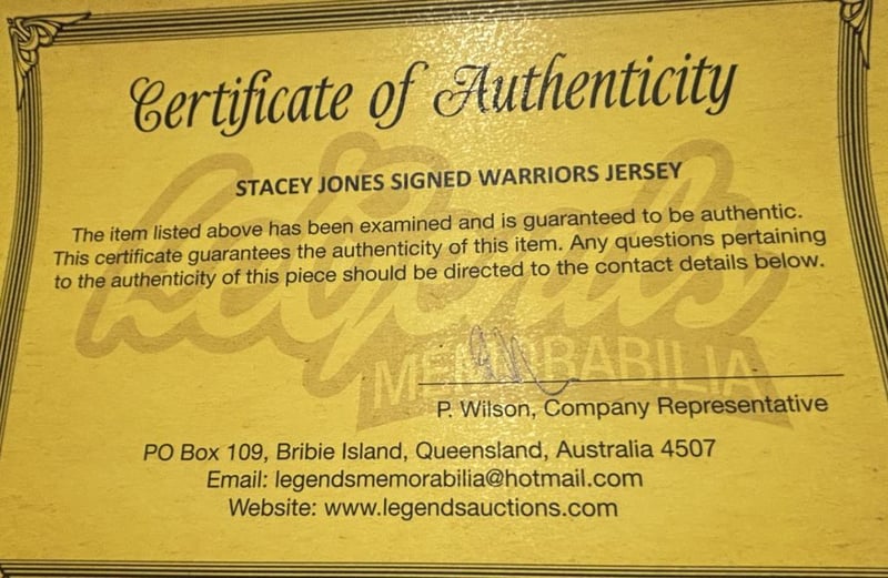 STACEY JONES SIGNED WARRIORS JERSEYStacey Jones Personally Signed Nz Warriors Jersey. The Jersey Is Size 5Xl. The Signature Has Faded Somewhat, But Is Legible. The Item Is Accompanied By A Certificate Of Authenticity.Condition: Good - Refer To Images584410+5