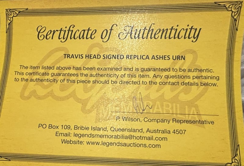 TRAVIS HEAD SIGNED ASHES URNTravis Head Personally Signed Replica Ashes Urn. The Item Is Accompanied By A Certificate Of Authenticity.Condition: Good - Refer To Images584410+22