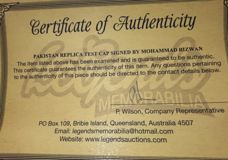MOHAMMAD RIZWAN SIGNED PAKISTAN TEST CAPMohammad Rizwan Personally Signed Replica Cricket Test Cap.The Item Is Accompanied By A Certificate Of Authenticity.Condition: Good - Refer To Images584410+29