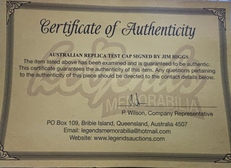 Jim Higgs Personally Signed Replica Cricket Test Cap.The Item Is Accompanied By A Certificate Of Authenticity.