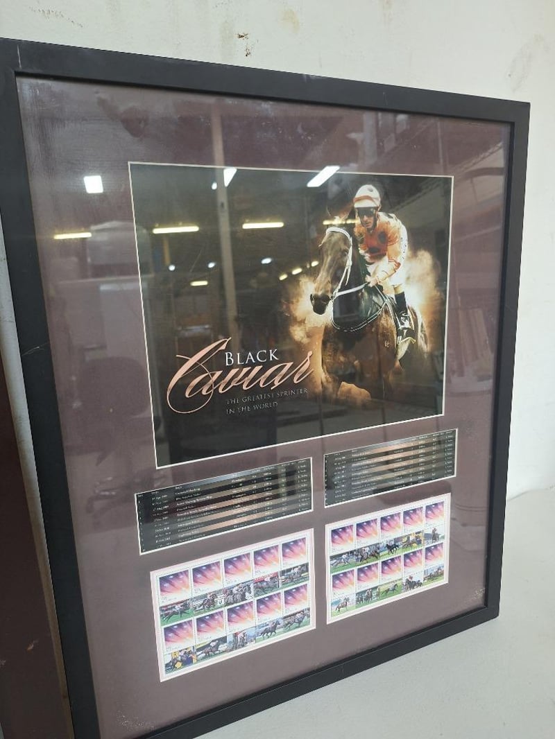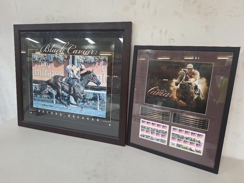 1 x BLACK CAVAIR "Record Breaker" LTD Edition 289 of 500 Print with mohoganany wooden frame, measures H:71.5 x L:82cm, 1 x BLACK CAVIAR "The Greatest Sprinter in The World" print with 40 Black cavair stamps, Measures H:59 x W:49cm in wooden frame