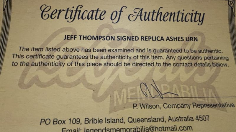 Jeff Thompson Personally Signed Replica Ashes Urn. The Item Is Accompanied By A Certificate Of Authenticity.