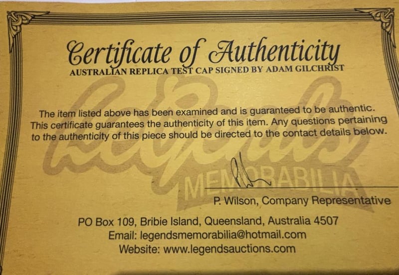 ADAM GILCHRIST SIGNED TEST CAPAdam Gilchrist Personally Signed Replica Test Match Cricket Cap.The Item Is Accompanied By A Certificate Of Authenticity.Condition: Good - Refer To Images584421+12
