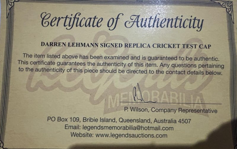 DARREN LEHMANN SIGNED TEST CAPDarren Lehmann Personally Signed Replica Test Match Cricket Cap.The Item Is Accompanied By A Certificate Of Authenticity.Condition: Good - Refer To Images584421+17