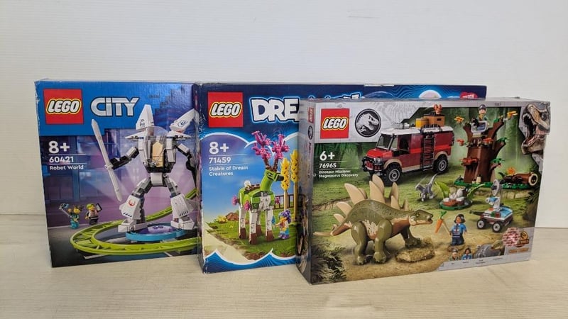 LEGO SETS INCLUDES: 76965 - DINOSAUR MISSIONS: STEGOSAURUS DISCOVERY 71459 - STABLE OF DREAM CREATURES 60421 - ROBOT WORLD Unopened - Boxes With Slight Damage Condition: Fair - Refer To Images 232856+1