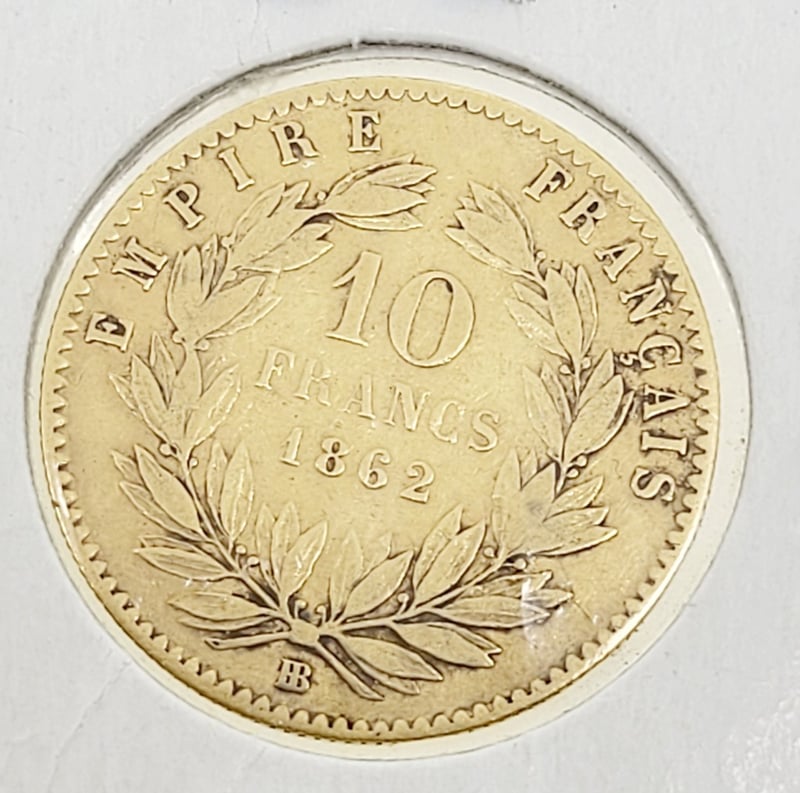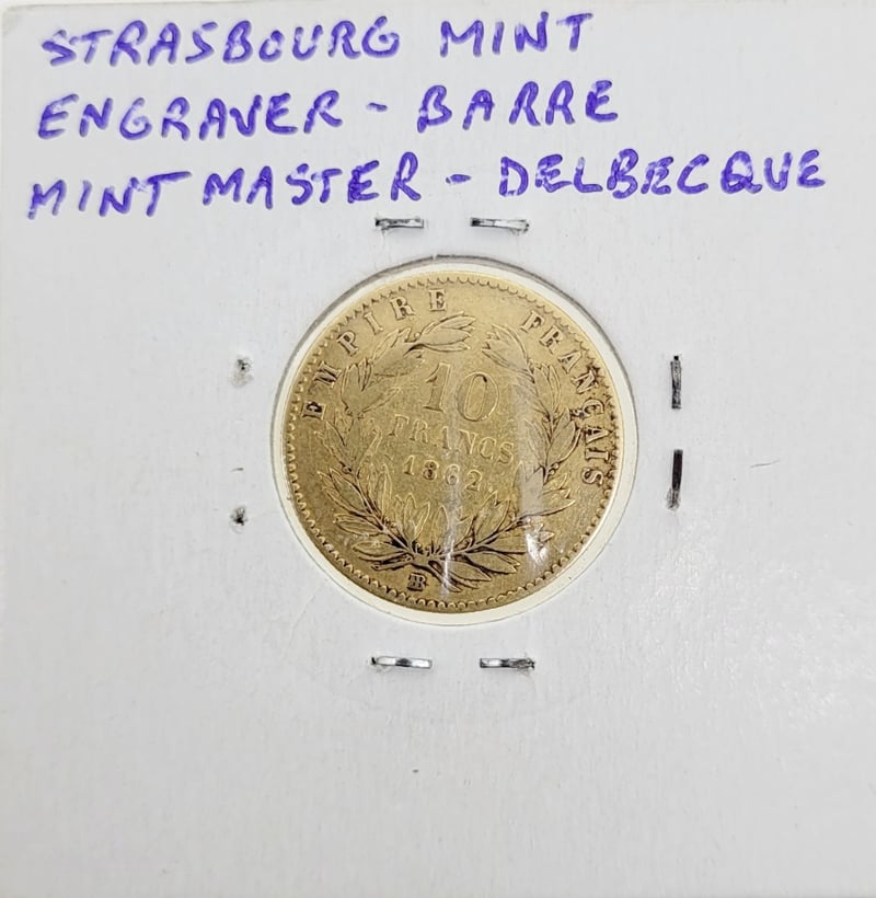 1862 BB FRENCH NAPOLEON III "LARGE 10 VARIETY" 10 FRANCS GOLD COIN , 0.900/3.2258G, STRASBOURG MINT
