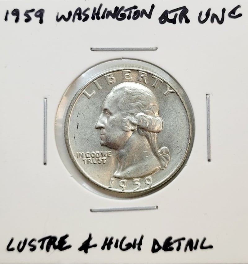 - 1959 Washington Qtr Unc ( Rare ) High Grade With Sharp Details And Lustre- 0.9/6.25G