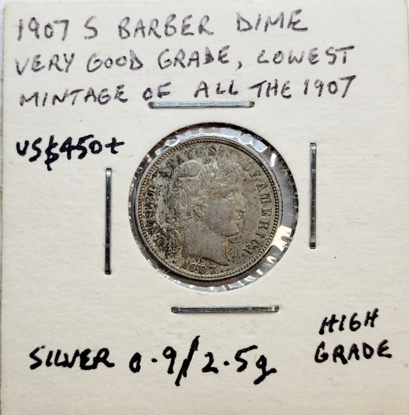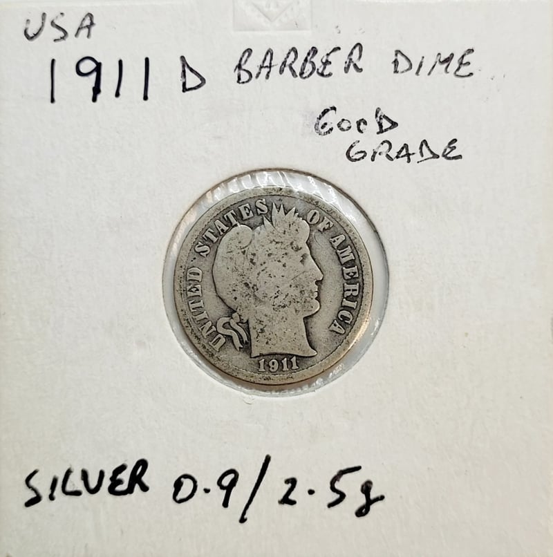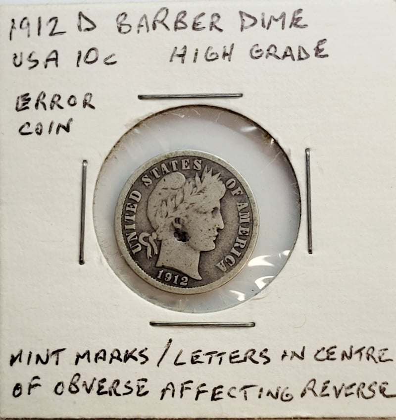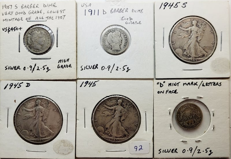 Provenance: 1970S High Grade , 1911 D Good Grade And 1912 D High Grade Error Coin ( Strike On Face On Reverse - Struck Through To Reverse , 3X Barber Dimes , And 1945 P , D And S Good Grade Walking Liberty Half Dollar , 0.9/0.3617 Oz Each ( Silver)