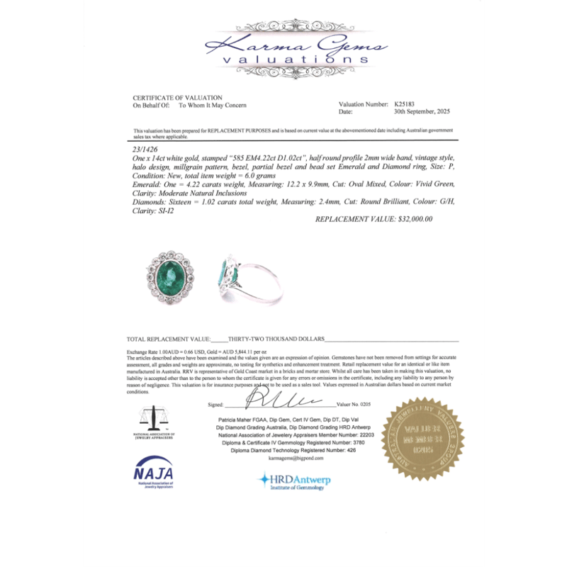 The Centre Features, One Oval Cut, Vivid Green, Emerald (4.22Ct, Moderate Inclusions), Bezel Set. Surrounding The Centre In A Halo Are, 16 Round Brilliant Cut, Diamonds (1.02Ct Tdw, G-H Colour, Si-I2 Clarity), Semi Bezel/Bead Set In White Gold With Millegrain Detail. Ring Size P.