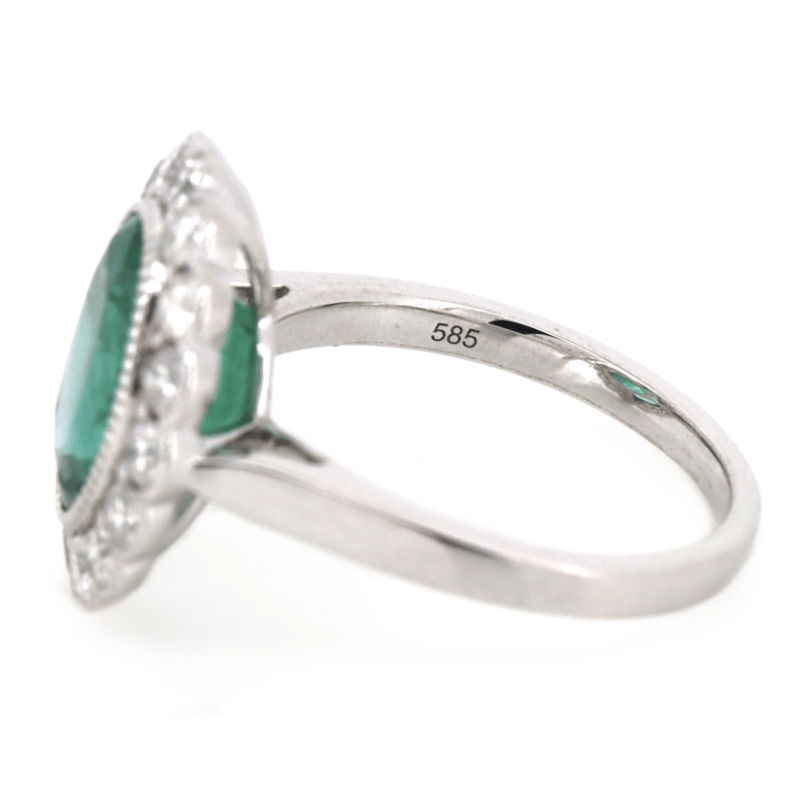 14K WHITE GOLD, EMERALD AND DIAMOND, VINTAGE INSPIRED HALO RING.