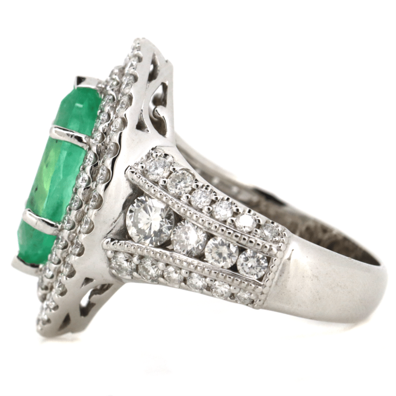 14K WHITE GOLD, 3.02CT COLOMBIAN EMERALD AND DIAMOND, DOUBLE HALO RING.