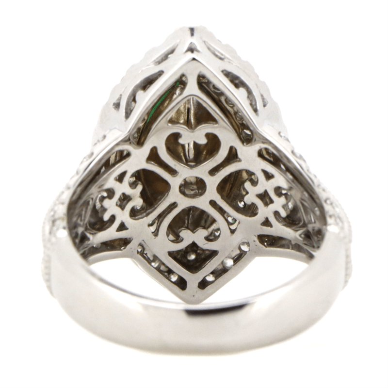 The Centre Features, One Marquise Cut, Colombian Emerald (3.02Ct, Moderately Included), Bezel Set. Encompassing The Design Are, 86 Round Brilliant Cut, Diamonds (1.80Ct Tdw, G-H Colour, Si1-Si2 Clarity), Pip Claw/Bead Set. Ring Size M 1/2.