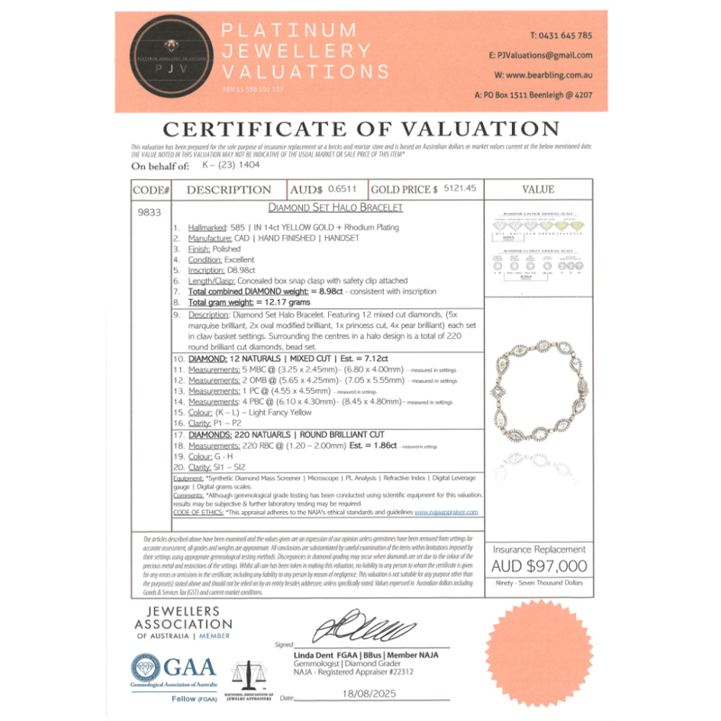 The Bracelet Features, 5 Mixed, 2 Oval Mixed, One Pear, And 4 Pear Cut, Diamonds (7.12Ct Tdw, K-L/ Light Fancy Yellow Colour, P1-P2 Clarity), Claw Set. Encompassing The Diamonds In A Halo Are, 220 Round Brilliant Cut, Diamonds (1.86Ct Tdw, G-H Colour, Si1-Si2 Clarity), Bead Set. The Bracelet Features A Concealed Box Snap Clasp With Safety Clip Attached.