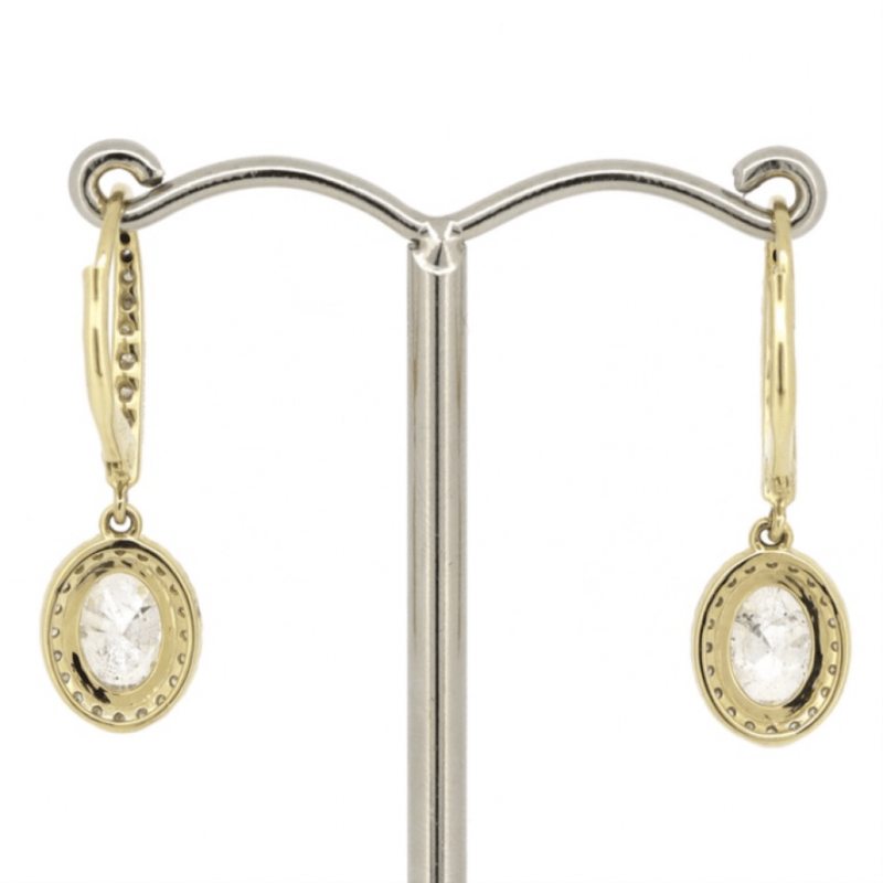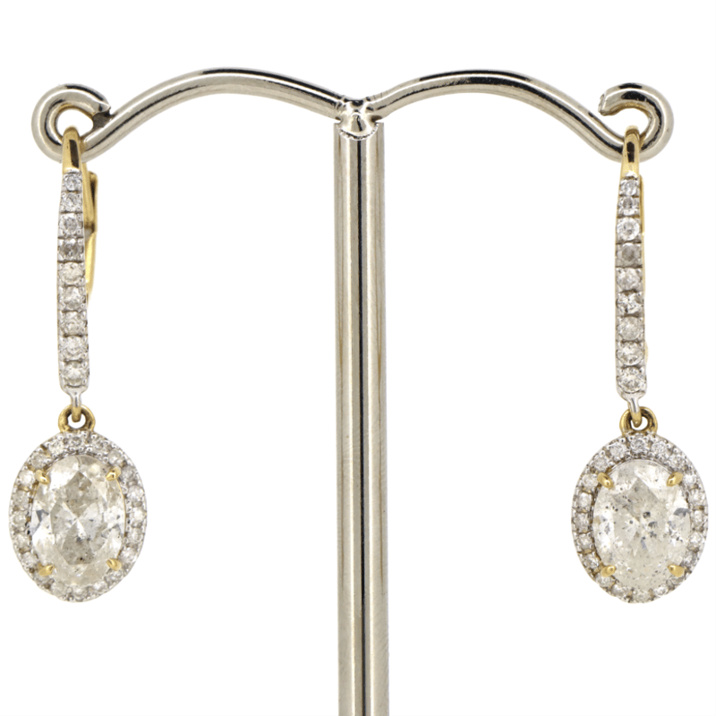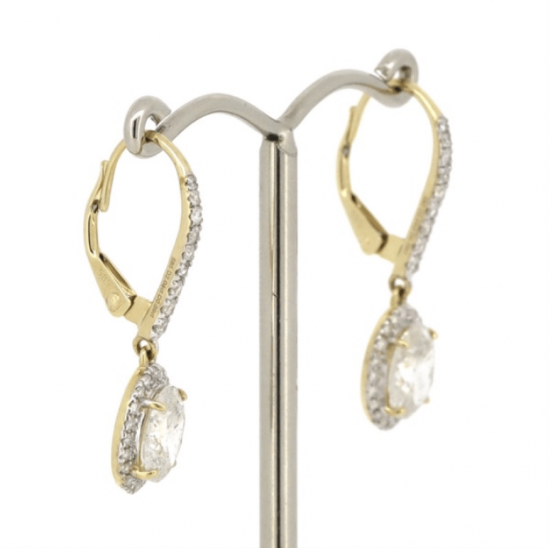 The Drops Feature, 2 Oval Brilliant Cut, Diamonds (2.04Ct Tdw, H-I Colour, P2-P3 Clarity), Claw Set. Surrounding The Centres In Halos And Decorating The Hooks Are, 56 Round Brilliant Cut, Diamonds (0.39Ct Tdw, I-K Colour, Si2-P2 Clarity), Claw Set. The Earrings Have Latch Back Closures.