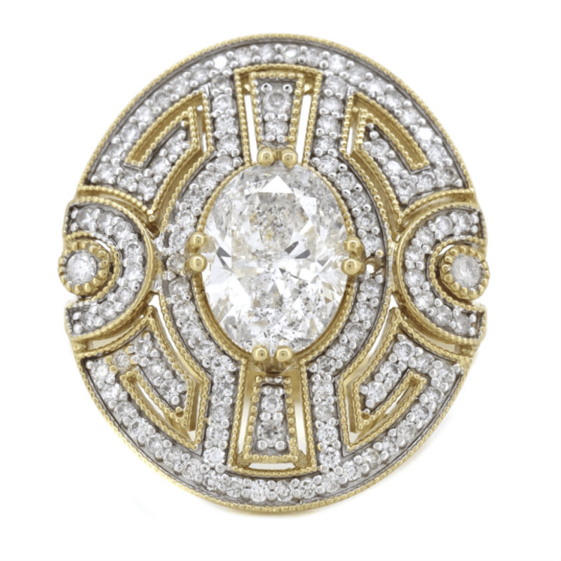 The Centre Features, One Oval Brilliant Cut, Diamond (2.26Ct, H-I Colour, P1 Clarity), Double 4 Claw Set. Encompassing The Design Are, 116 Round Brilliant Cut, Diamonds (0.63Ct Tdw, H-K Colour, Si1-Si2 Clarity), Micro-Bead Set With Millegrain Detail. Ring Size N.
