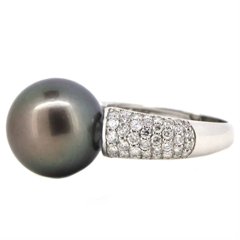 The Centre Features, One Near Round, Black With Purple/Green Overtones, Cultured Tahitian Pearl (24.36Ct/15.00Mm Size, Aa Lustre, Very Few Blemishes), Drill Set. Decorating The Band Are, 84 Round Brilliant Cut, Diamonds (1.32Ct Tdw, G-H Colour, Si1-Si2 Clarity), Pave Set. Ring Size O 1/2.