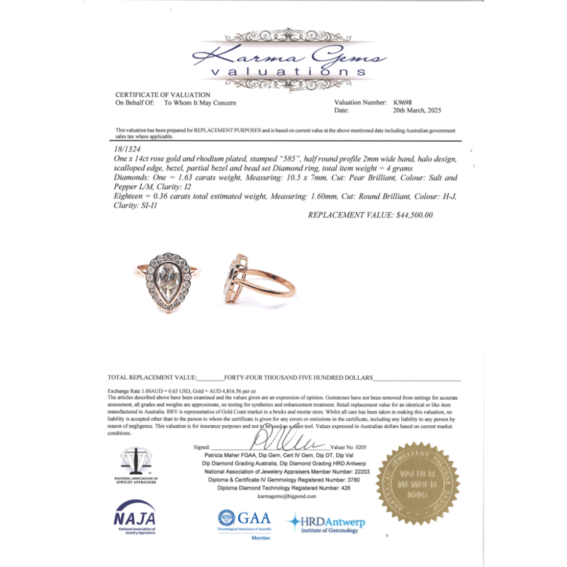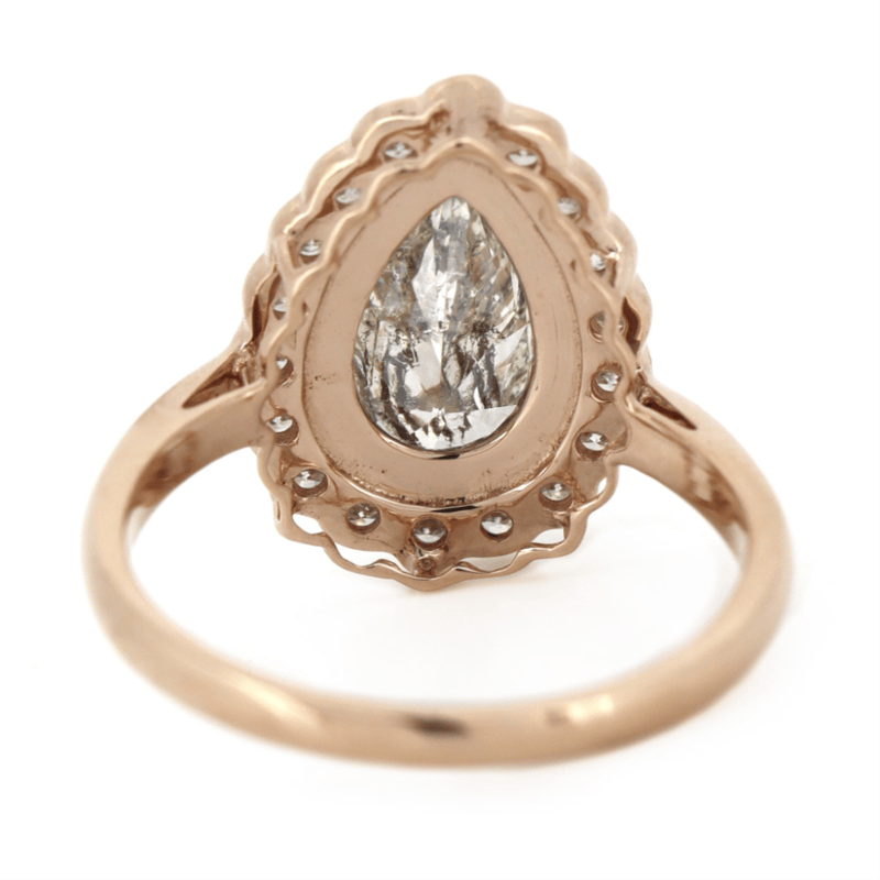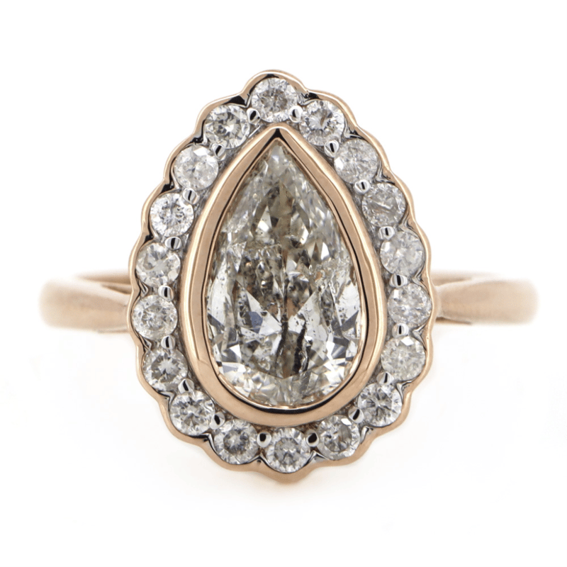 The Central Features, One Pear Brilliant Cut, Diamond (1.63Ct, L-M Colour, I2 Clarity), Bezel Set. Surrounding The Centre In Halo Are, 18 Round Brilliant Cut, Diamonds (0.36Ct Tdw, H-J Colour, Si-I1 Clarity), Bead Set. Ring Size P.