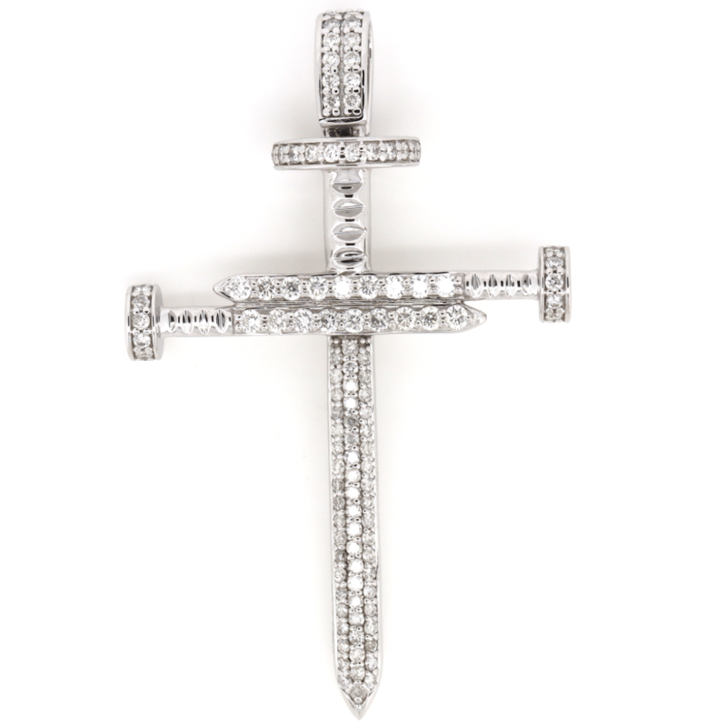 14K WHITE GOLD, 0.95CT TDW DIAMOND, CRUCIFIX PENDANT.