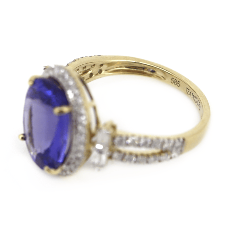 14K YELLOW GOLD, TANZANITE AND DIAMOND, HALO SPLIT BAND RING.