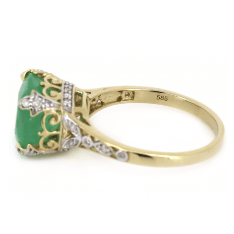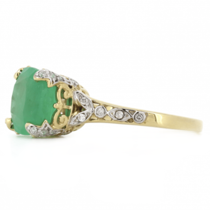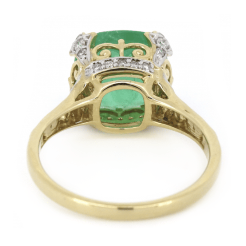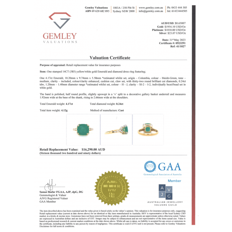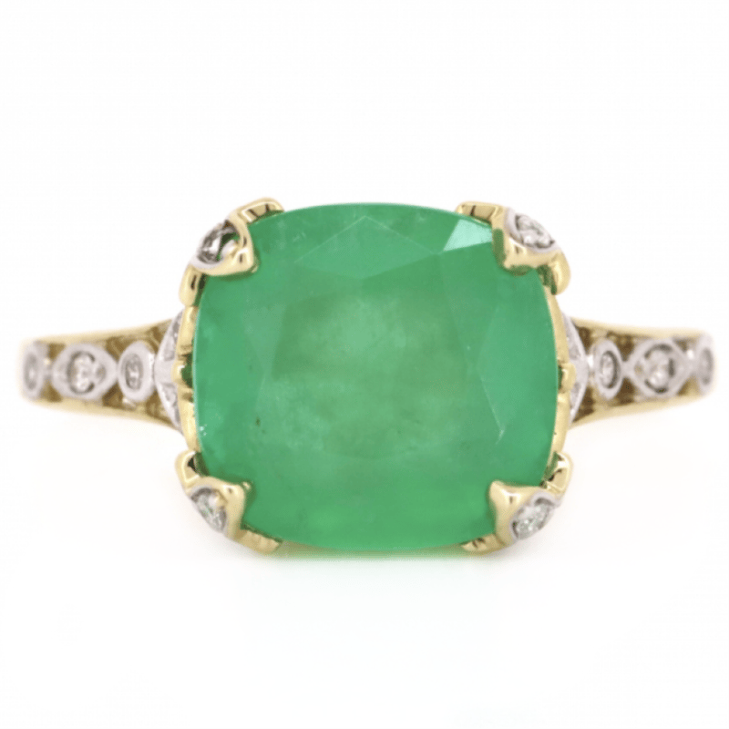 14K YELLOW/WHITE GOLD, 4.17CT COLOMBIAN EMERALD AND DIAMOND, DRESS RING. The Centre Features, One Cushion Cut, Medium Bluish-Green, Colombian Emerald (4.17Ct, Included, Enhanced), Claw Set. Decorating The Setting And Band Are, 32 Round Brilliant Cut, Diamonds (0.24Ct Tdw, H-J Colour, Si2-I2 Clarity), Individually Bezel/Bead Set In White Gold. Ring Size P. Valuations Provided by an Independent Third-Party Professional Not Directly Associated With Lloyds Auctions at AUD $$16,290.00This valuation has been conducted by an independent third-party professional. The valuation amount is an assessment by the issuing valuer and does not reflect the auction value of the item. Any inquiries regarding the valuation should be directed to the issuing valuer (refer to contact details on the certificate), as Lloyds Auctions has no affiliation or influence over the valuation, the valuer, or the stated amount. Condition: Good - Refer Images 0645914+5145