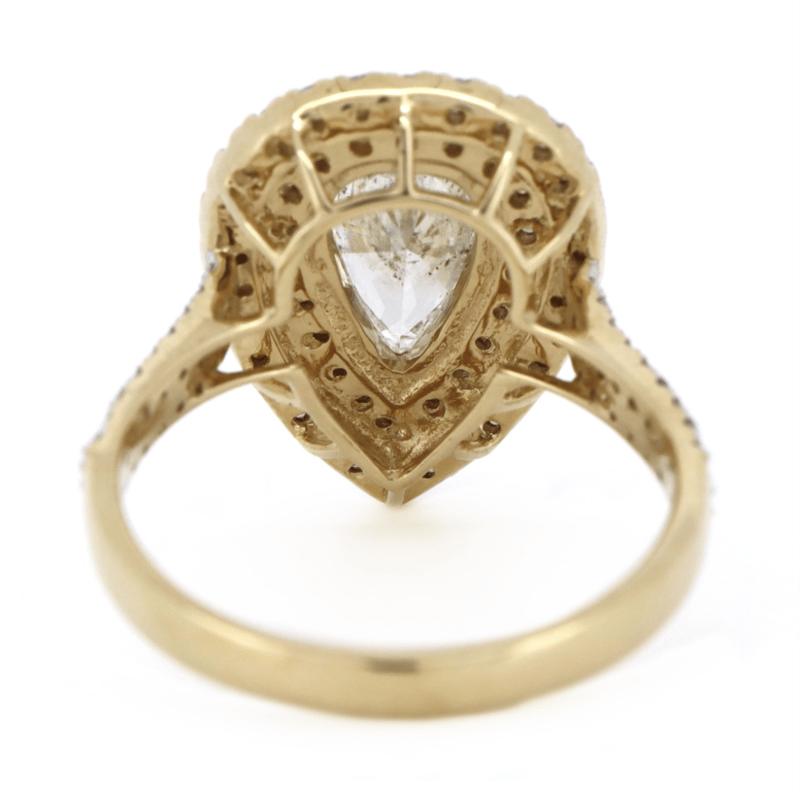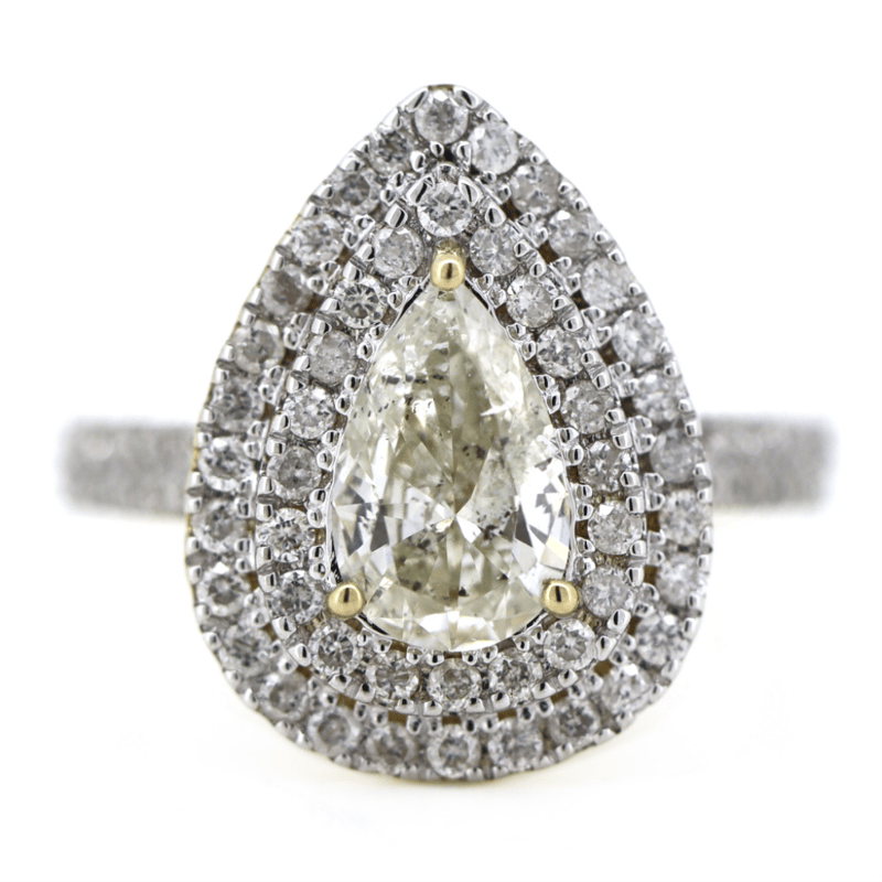 The Centre Features, One Pear Cut, Fancy Light Yellow, Diamond (1.01Ct, Si2 Clarity), 3 Claw Set. Surrounding The Centre In A Double Halo And Decorating The Band Are, 84 Round Brilliant Cut, Diamonds (0.66Ct Tdw, G-I Colour, Si2+ Clarity), Claw Set. Ring Size M.