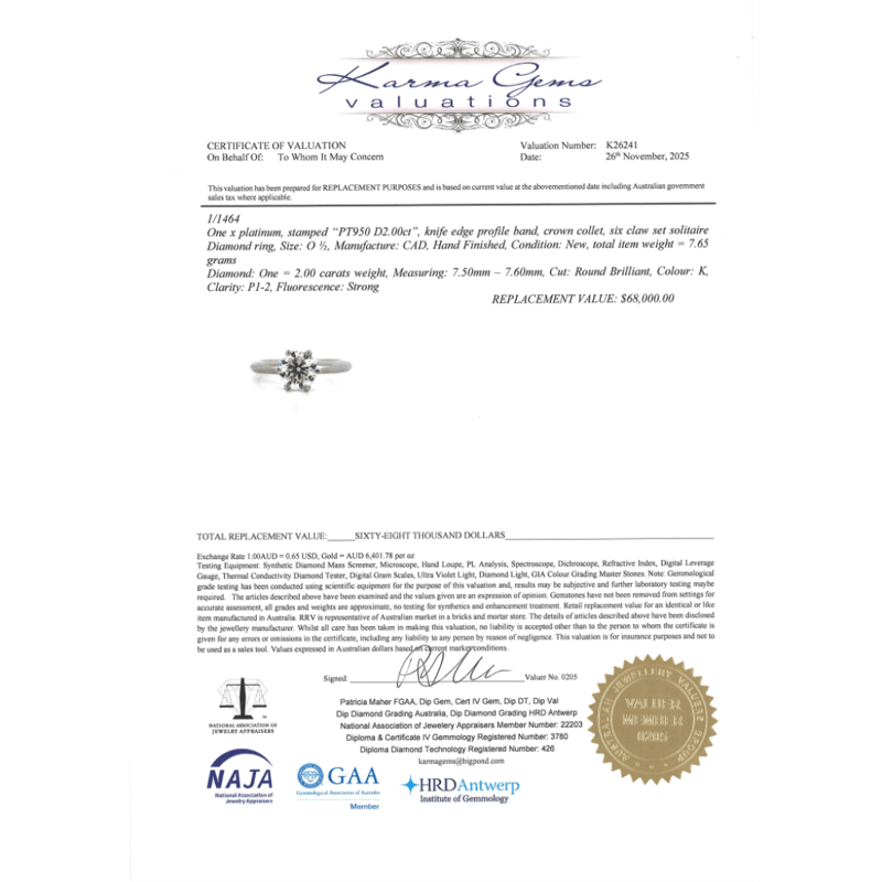 The Centre Features, One Round Brilliant Cut, Diamond (2.00Ct Tdw, J- K Colour, P1- P2 Clarity), 6 Claw Set. Ring Size O 1/2.