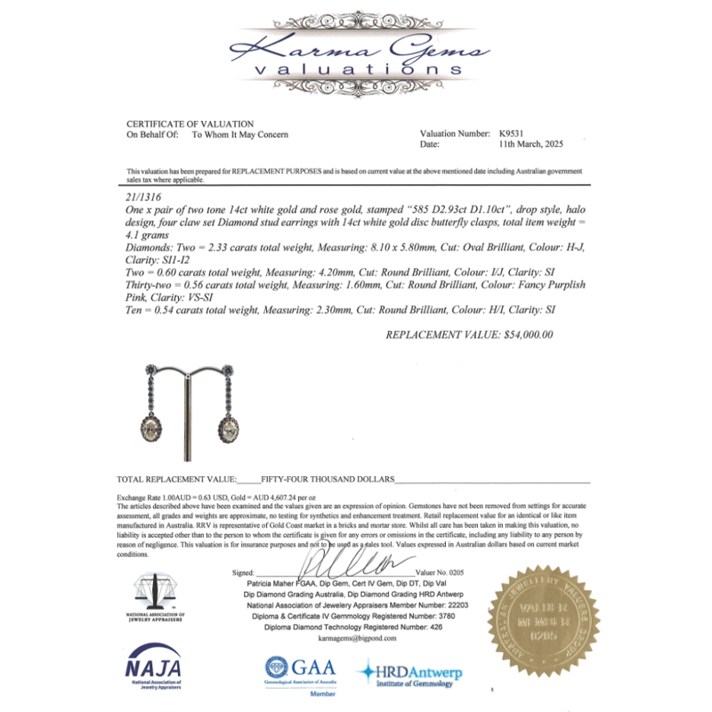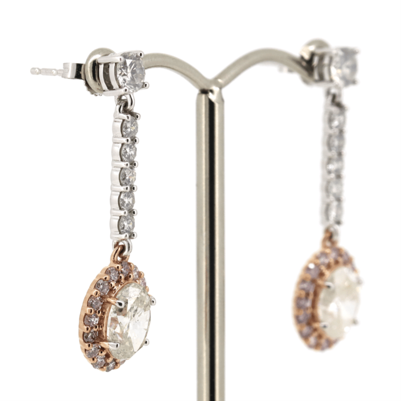 The Design Features, 2 Oval Brilliant Cut, Diamonds (2.33Ct Tdw, H-J Colour, Si1-I2 Clarity), Claw Set. Encompassing The Design Are, 2 Round Brilliant Cut, Diamonds (0.60Ct Tdw, I-J Colour, Si- Clarity),Claw Set. Accompanying The Design Are, 32 Round Brilliant Cut, Fancy Purplish Pink, Diamonds (0.56Ct Tdw, Vs-Si-Clarity), Claw Set. Offsetting In A Drop Are, Round Brilliant Cut, Diamonds (0.54Ct Tdw, H-I Colour, Si-Clarity), Bead Set. The Earrings Have Post Backs, With 14K White Gold Butterfly Clasps.