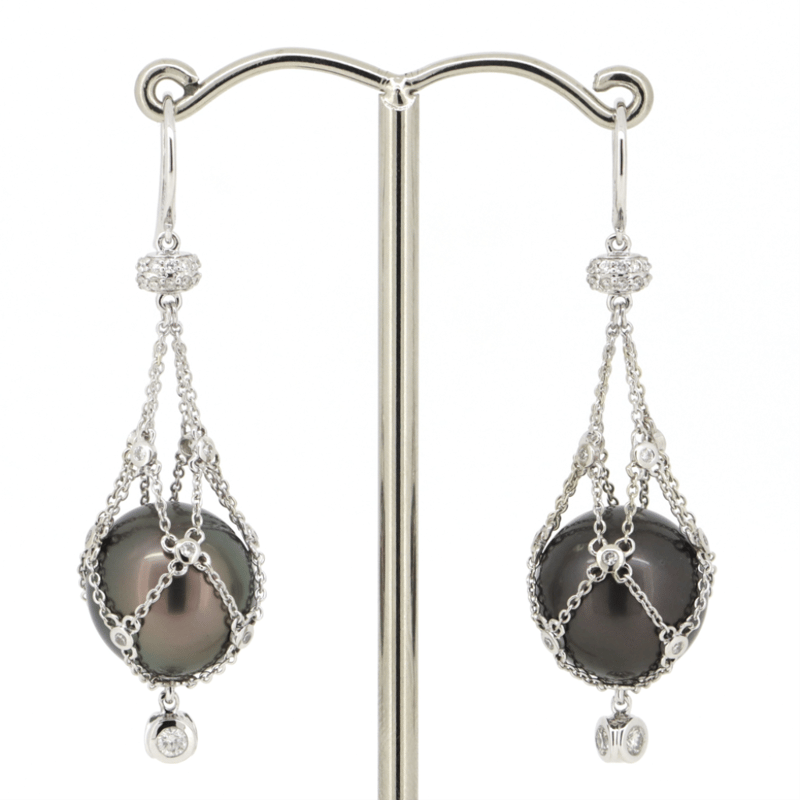 The Earrings Feature, 2 Near Round , Black With Purple And Silver Overtones, Cultured Tahitian Pearls (30.61Ct Tsw/12.50Mm Size, Natural Growth Blemishes). The "Cage" Features, 70 Round Brilliant Cut, Diamonds (0.72Ct Tdw, H-J Colour, Si-I2 Clarity), Bead/Bezel Set. The Earrings Feature Shepherd Hooks.