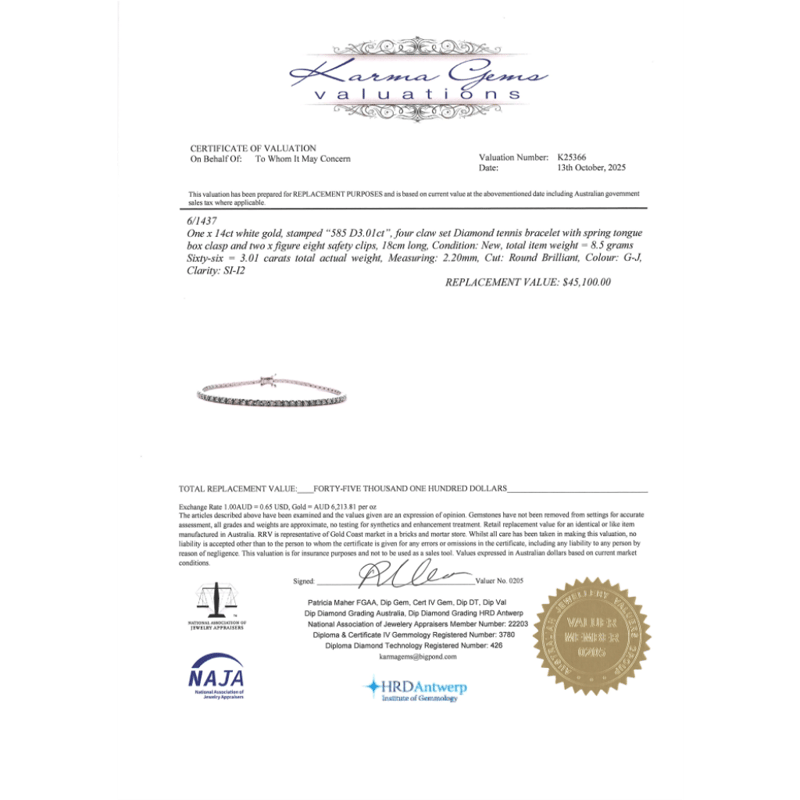The Bracelet Features, 66 Round Brilliant Cut, Diamonds (3.01Ct Tdw, G-J Colour, Si-I2 Clarity), Claw Set. The Bracelet Has A Box Lock With 2 Figure Eight Safety Latches. Bracelet Length 17.5Cm.