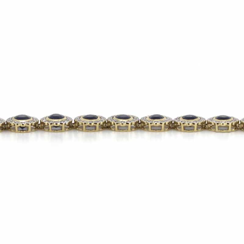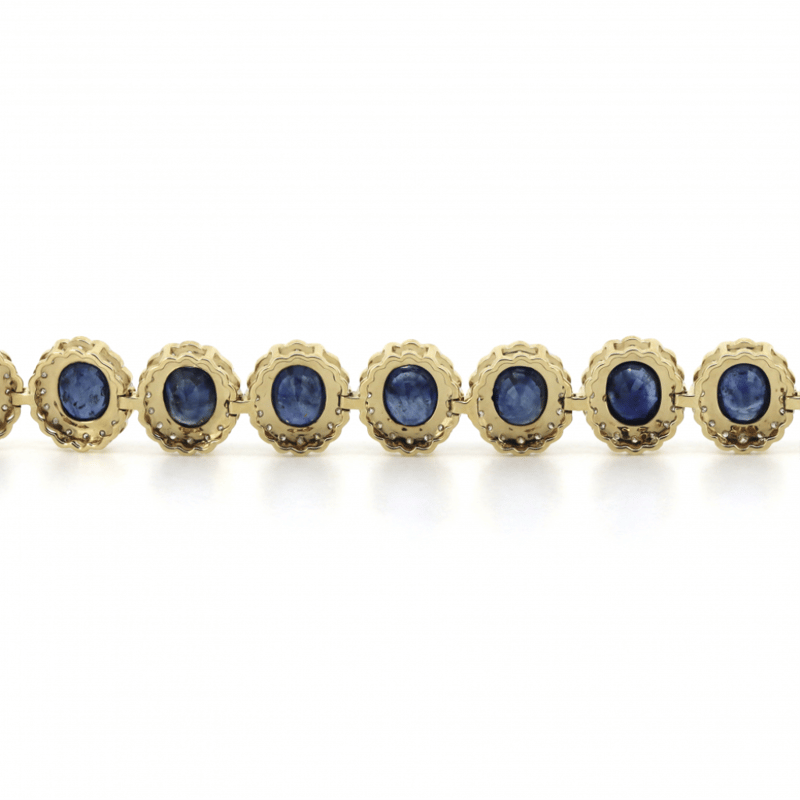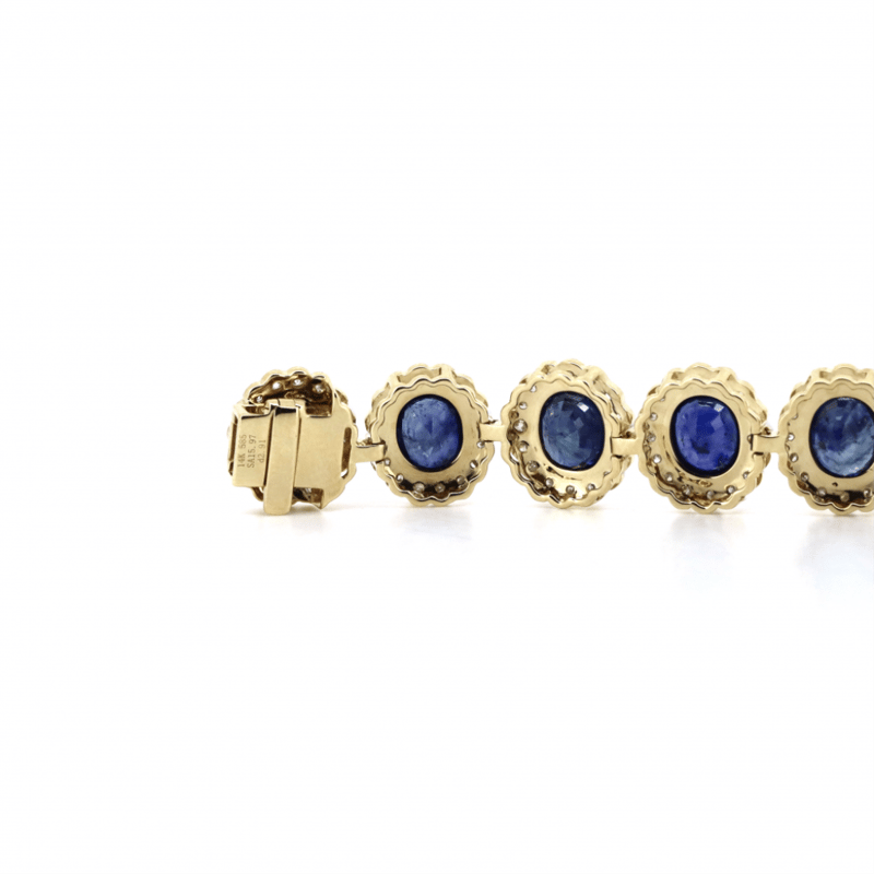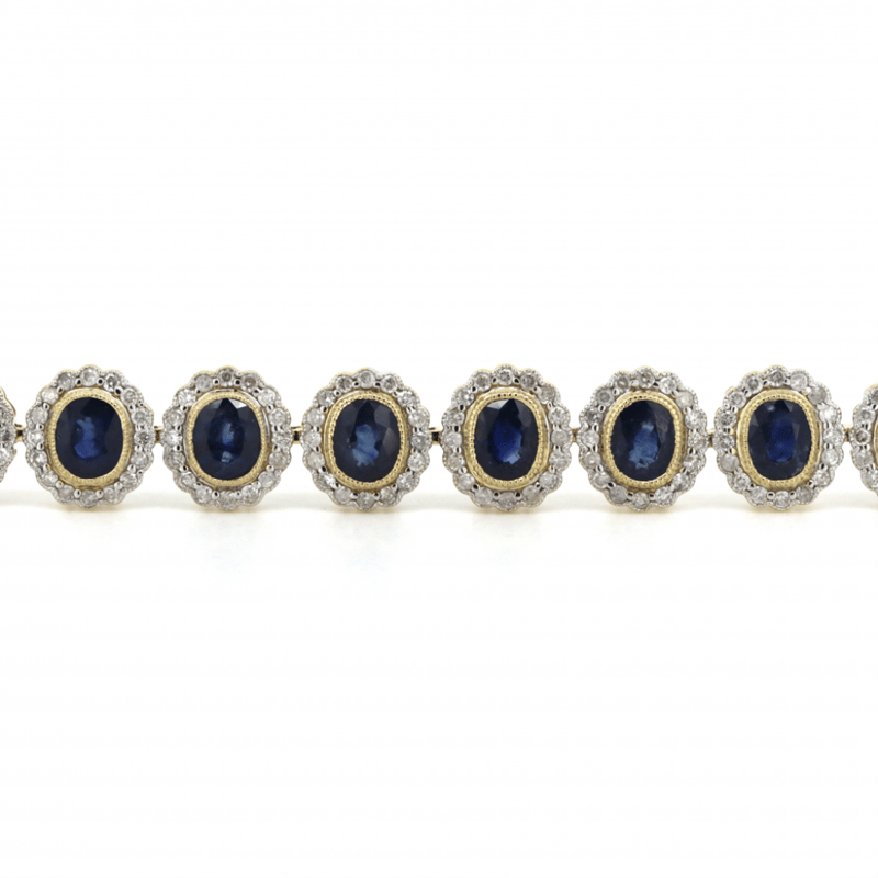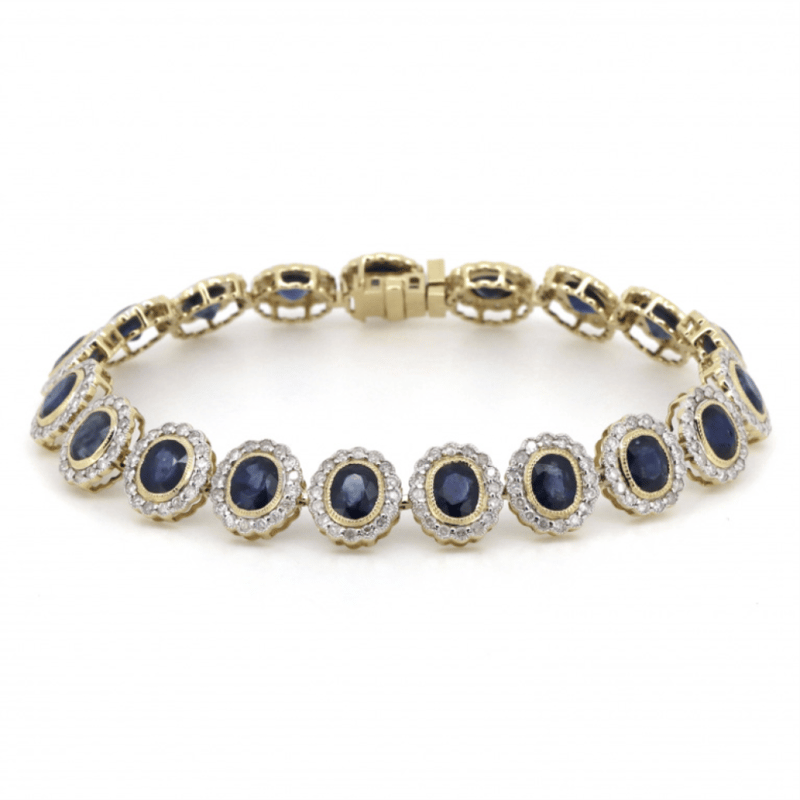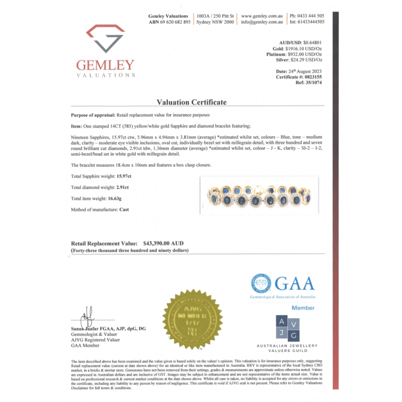 14K YELLOW/WHITE GOLD, BLUE SAPPHIRE AND DIAMOND, HALO BRACELET. The Design Features, 19 Oval Cut, Blue, Sapphires (15.97Ct Tsw, Moderate Eye Visible Inclusions), Bezel Set With Millegrain Detail. Surrounded By, 307 Round Brilliant Cut, Diamonds (2.91Ct Tdw, J-K Colour, Si2-I2 Clarity), Semi-Bezel/Bead Set. The Bracelet Has A Box Lock Closure With A Hinged Safety Catch. Bracelet Length Is 18.4Cm. Valuations Provided by an Independent Third-Party Professional Not Directly Associated With Lloyds Auctions at AUD $$43,390.00This valuation has been conducted by an independent third-party professional. The valuation amount is an assessment by the issuing valuer and does not reflect the auction value of the item. Any inquiries regarding the valuation should be directed to the issuing valuer (refer to contact details on the certificate), as Lloyds Auctions has no affiliation or influence over the valuation, the valuer, or the stated amount. Condition: Good - Refer Images 0645922+5218