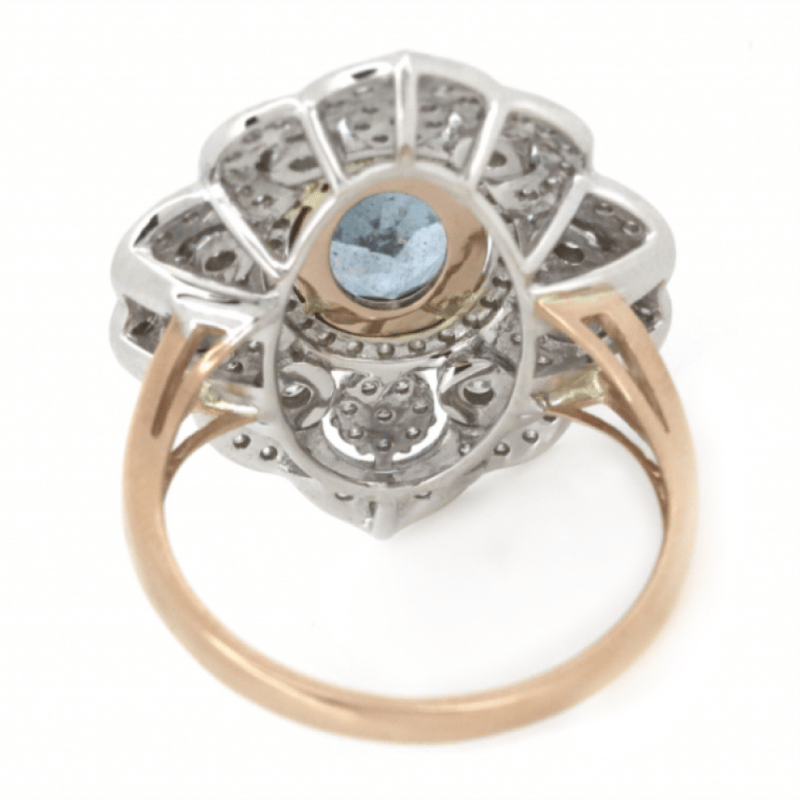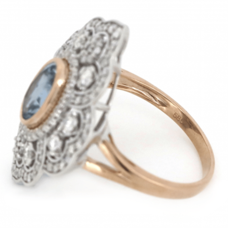 14K ROSE/WHITE GOLD, AQUAMARINE AND DIAMOND, DECORATIVE RING.