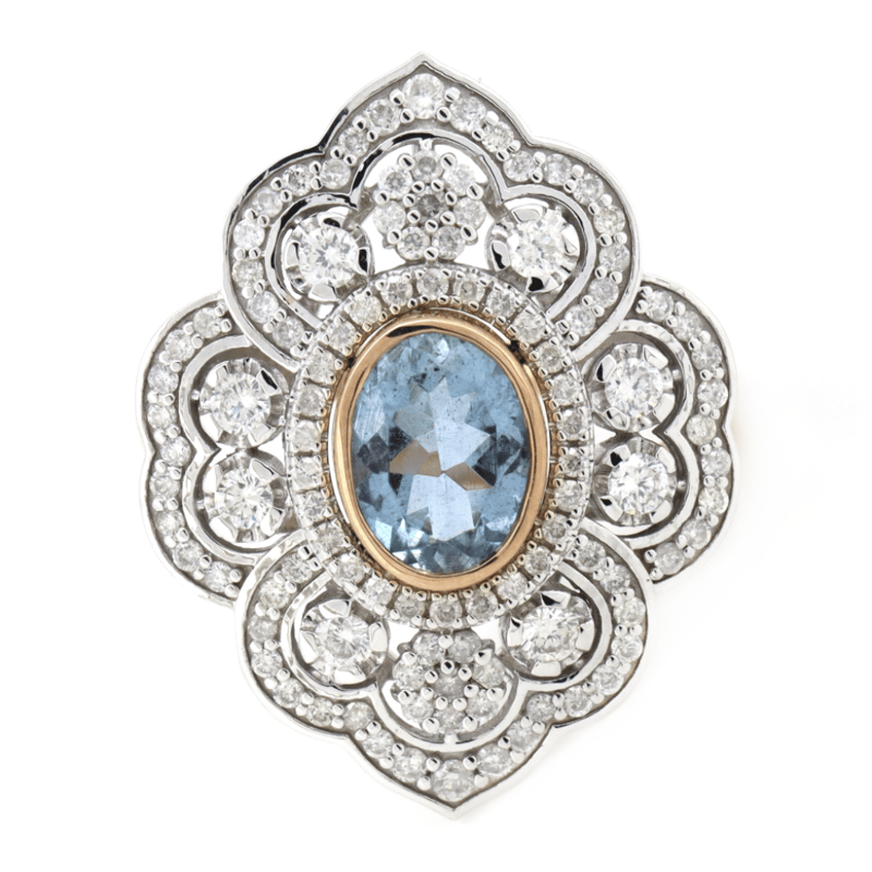 The Centre Features, One Oval Cut, Moderate Blue, Aquamarine (1.01Ct, Slightly Included), Bezel Set. Encompassing The Centre Are, 106 Round Brilliant Cut, Diamonds (0.85Ct Tdw, G-H Colour, Si1-Si2 Clarity), Bead/Claw Set. Ring Size N 1/2.
