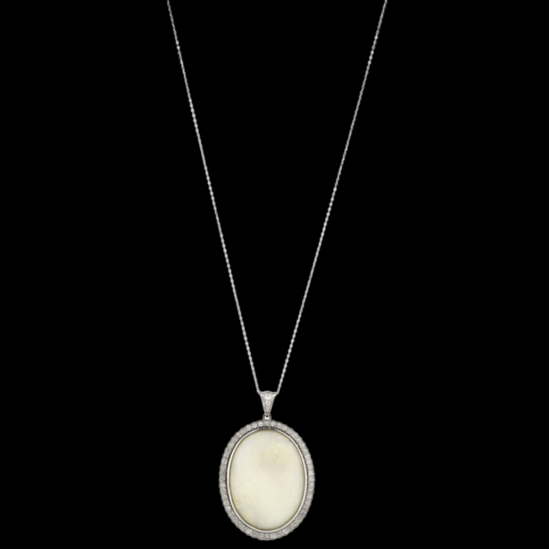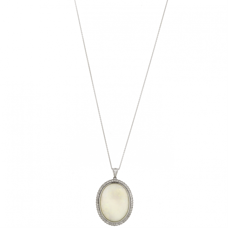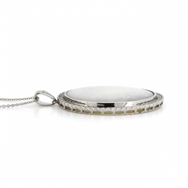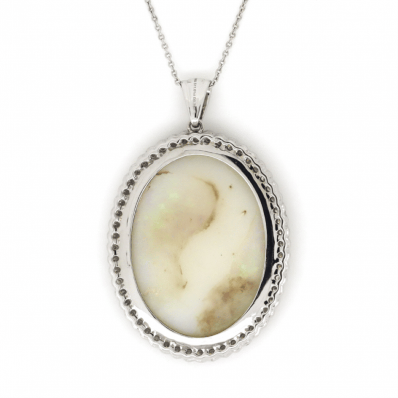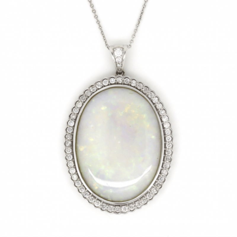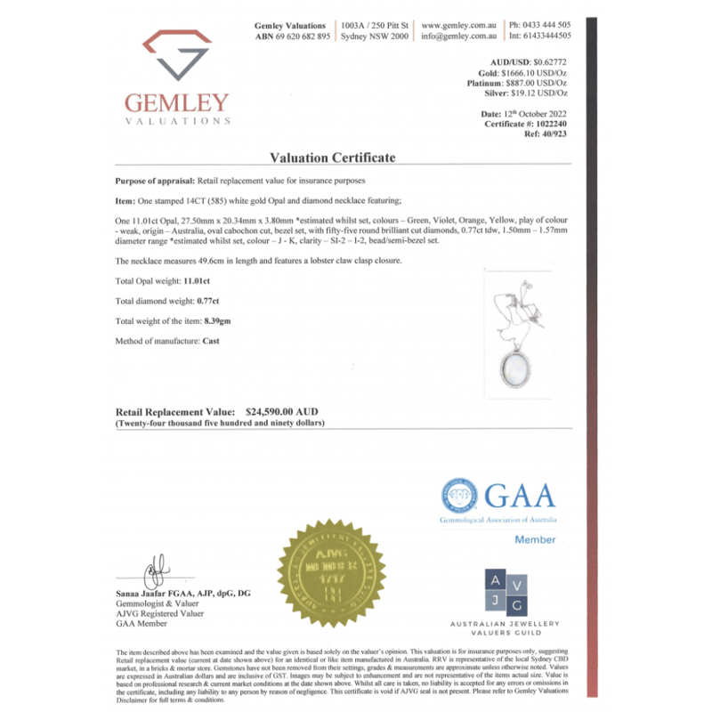 14K WHITE GOLD, 11.01CT AUSTRALIAN OPAL AND DIAMOND, STATEMENT NECKLACE. The Pendant Features, One Oval Cabochon Cut, Australian Opal (11.01Ct, Green-Violet-Orange-Yellow Weak Colour Play), Bezel Set. Surrounding The Opal In A Halo And Decorating The Bail Are, 55 Round Brilliant Cut, Diamonds (0.77Ct Tdw, J-K Colour, Si2-I2 Clarity), Bead/Semi-Bezel Set. The Necklace Has A Lobster Claw Clasp. Chain Length Is 49Cm (Adjustable). Valuations Provided by an Independent Third-Party Professional Not Directly Associated With Lloyds Auctions at AUD $$24,590.00This valuation has been conducted by an independent third-party professional. The valuation amount is an assessment by the issuing valuer and does not reflect the auction value of the item. Any inquiries regarding the valuation should be directed to the issuing valuer (refer to contact details on the certificate), as Lloyds Auctions has no affiliation or influence over the valuation, the valuer, or the stated amount. Condition: Good - Refer Images 0645922+5245